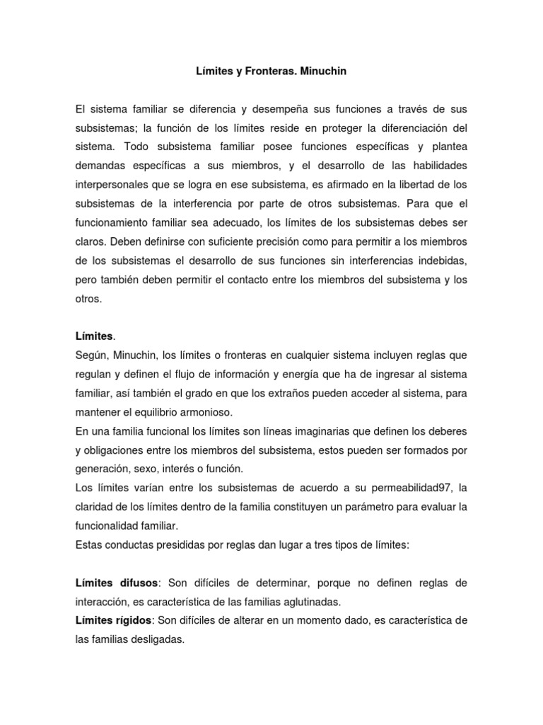 Lmites. Segn, Minuchin, los lmites o fronteras en cualquier sistema incluyen reglas que regulan y definen el flujo de informacin y energa que ha de ingresar al sistema familiar, as tambin el grado en que los extraos pueden acceder al sistema, para mantener el equilibrio armonioso. En una familia funcional los lmites son lneas imaginarias que definen los deberes y obligaciones entre los miembros del subsistema, estos pueden ser formados por generacin, sexo, inters o funcin. Los lmites varan entre los subsistemas de acuerdo a su permeabilidad97, la claridad de los lmites dentro de la familia constituyen un parmetro para evaluar la funcionalidad familiar. Estas conductas presididas por reglas dan lugar a tres tipos de lmites: