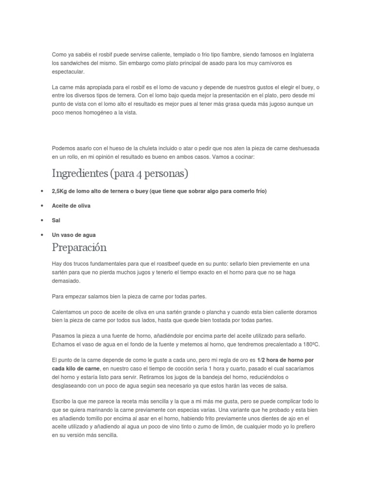 del mismo. Sin embargo como plato principal de asado para los muy carnvoros es espectacular. La carne ms apropiada para el rosbif es el lomo de vacuno y depende de nuestros gustos el elegir el buey, o entre los diversos tipos de ternera. Con el lomo bajo queda mejor la presentacin en el plato, pero desde mi punto de vista con el lomo alto el resultado es mejor pues al tener ms grasa queda ms jugoso aunque un poco menos homogneo a la vista.