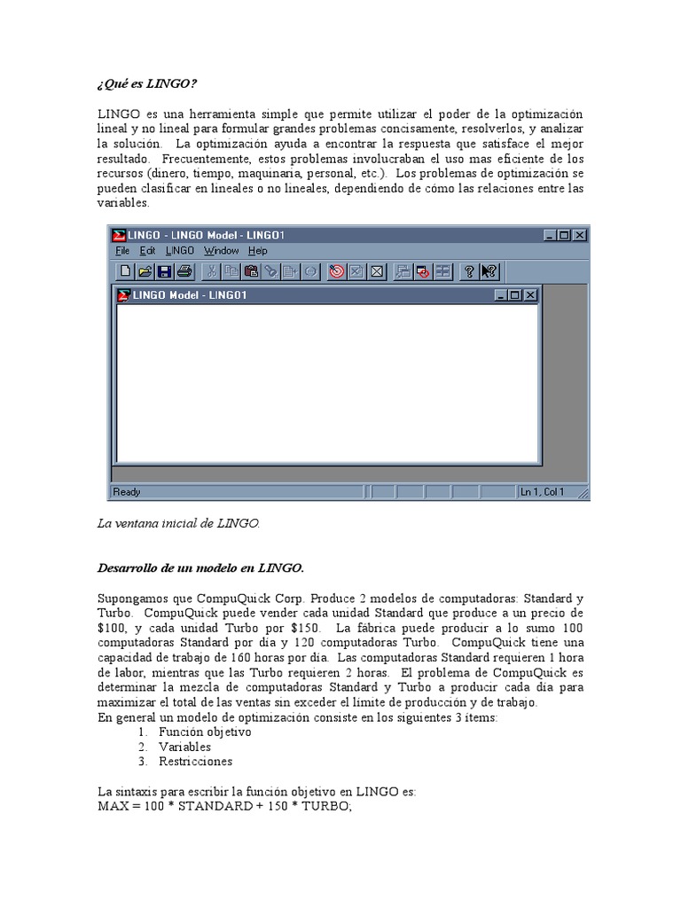 LINGO es una herramienta simple que permite utilizar el poder de la optimizacin lineal y no lineal para formular grandes problemas concisamente, resolverlos, y analizar la solucin. La optimizacin ayuda a encontrar la respuesta que satisface el me or resultado. !recuentemente, estos problemas involucraban el uso mas eficiente de los recursos "dinero, tiempo, maquinaria, personal, etc.#. Los problemas de optimizacin se pueden clasificar en lineales o no lineales, dependiendo de cmo las relaciones entre las variables.