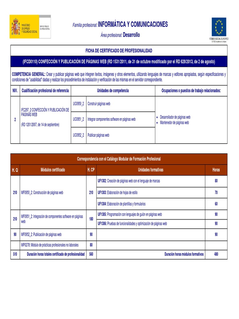FICHA DE CERTIFICADO DE PROFESIONALIDAD (IFCD0110) CONFECCIN Y PUBLICACIN DE PGINAS WEB (RD 1531/2011, de 31 de octubre modificado por el RD 628/2013, de 2 de agosto)