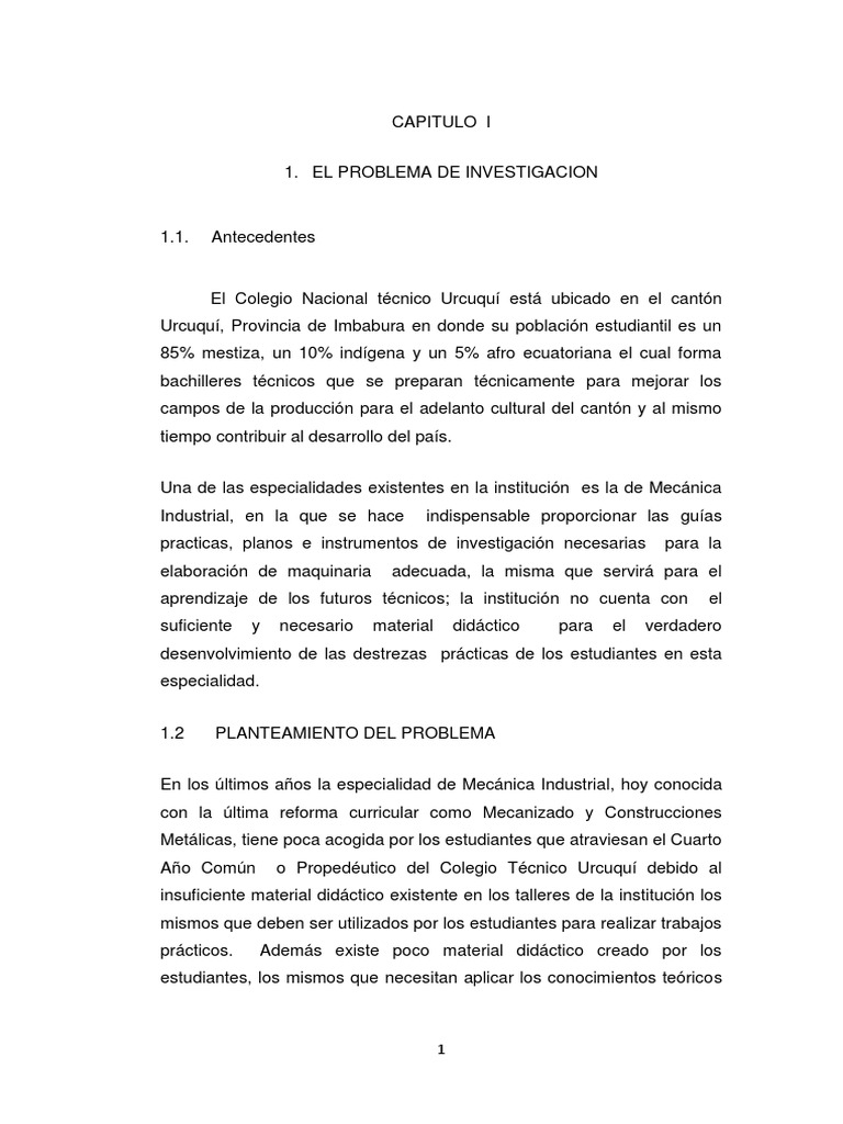 El Colegio Nacional tcnico Urcuqu est ubicado en el cantn Urcuqu, Provincia de Imbabura en donde su poblacin estudiantil es un 85% mestiza, un 10% indgena y un 5% afro ecuatoriana el cual forma bachilleres tcnicos que se preparan tcnicamente para mejorar los campos de la produccin para el adelanto cultural del cantn y al mismo tiempo contribuir al desarrollo del pas. Una de las especialidades existentes en la institucin es la de Mecnica Industrial, en la que se hace indispensable proporcionar las guas para la