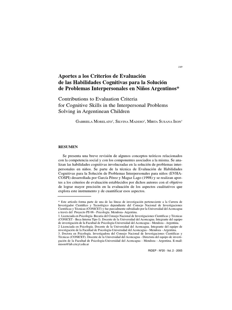Aportes a los Criterios de Evaluacin de las Habilidades Cognitivas para la Solucin de Problemas Interpersonales en Nios Argentinos* Contributions to Evaluation Criteria for Cognitive Skills in the Interpersonal Problems Solving in Argentinean Children