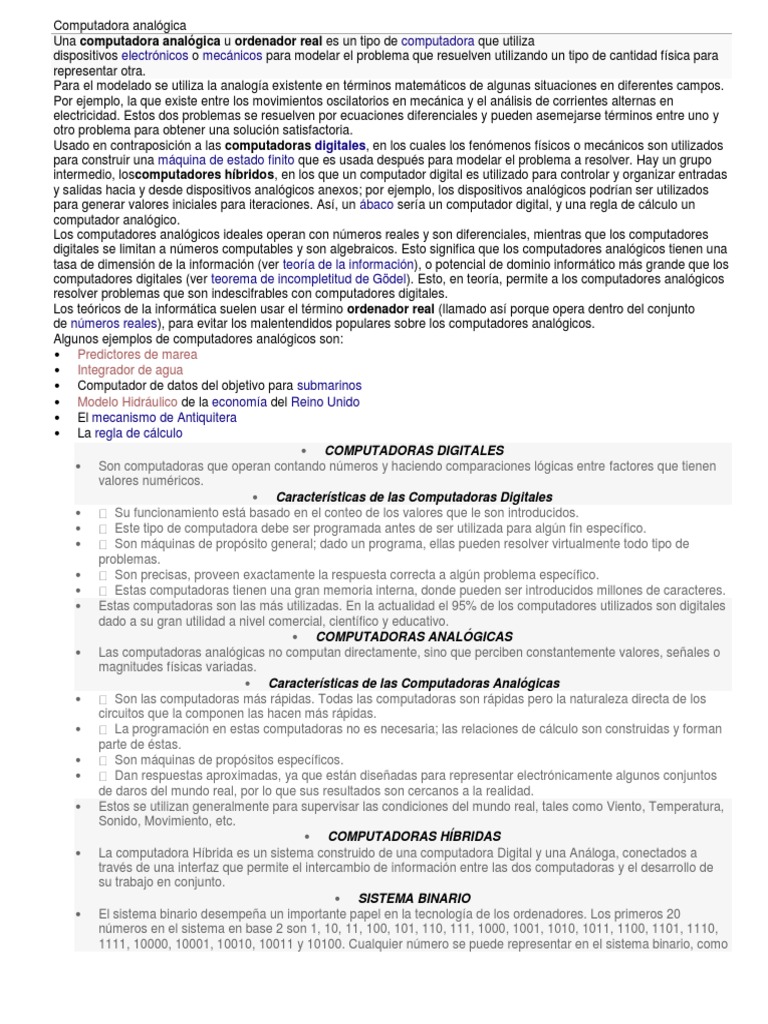 modelar el problema que resuelven utilizando un tipo de cantidad fsica para representar otra. Para el modelado se utiliza la analoga existente en trminos matemticos de algunas situaciones en diferentes campos. Por ejemplo, la que existe entre los movimientos oscilatorios en mecnica y el anlisis de corrientes alternas en electricidad. Estos dos problemas se resuelven por ecuaciones diferenciales y pueden asemejarse trminos entre uno y otro problema para obtener una solucin satisfactoria. Usado en contraposicin a las computadoras digitales, en los cuales los fenmenos fsicos o mecnicos son utilizados para construir una mquina de estado finito que es usada despus para modelar el problema a resolver. Hay un grupo intermedio, loscomputadores hbridos, en los que un computador digital es utilizado para controlar y organizar entradas y salidas hacia y desde dispositivos analgicos anexos; por ejemplo, los dispositivos analgicos podran ser utilizados para generar valores iniciales para iteraciones. As, un baco sera un computador digital, y una regla de clculo un computador analgico. Los computadores analgicos ideales operan con nmeros reales y son diferenciales, mientras que los computadores digitales se limitan a nmeros computables y son algebraicos. Esto significa que los computadores analgicos tienen una tasa de dimensin de la informacin (ver teora de la informacin), o potencial de dominio informtico ms grande que los computadores digitales (ver teorema de incompletitud de Gdel). Esto, en teora, permite a los computadores analgicos resolver problemas que son indescifrables con computadores digitales. Los tericos de la informtica suelen usar el trmino ordenador real (llamado as porque opera dentro del conjunto de nmeros reales), para evitar los malentendidos populares sobre los computadores analgicos. Algunos ejemplos de computadores analgicos son: Predictores de marea Integrador de agua Computador de datos del objetivo para submarinos Modelo Hidrulico de la economa del Reino Unido El mecanismo de Antiquitera La regla de clculo COMPUTADORAS DIGITALES Son computadoras que operan contando nmeros y haciendo comparaciones lgicas entre factores que tienen valores numricos. Caractersticas de las Computadoras Digitales Su funcionamiento est basado en el conteo de los valores que le son introducidos. Este tipo de computadora debe ser programada antes de ser utilizada para algn fin especfico. Son mquinas de propsito general; dado un programa, ellas pueden resolver virtualmente todo tipo de problemas. Son precisas, proveen exactamente la respuesta correcta a algn problema especfico. Estas computadoras tienen una gran memoria interna, donde pueden ser introducidos millones de caracteres. Estas computadoras son las ms utilizadas. En la actualidad el 95% de los computadores utilizados son digitales dado a su gran utilidad a nivel comercial, cientfico y educativo. COMPUTADORAS ANALGICAS Las computadoras analgicas no computan directamente, sino que perciben constantemente valores, seales o magnitudes fsicas variadas. Caractersticas de las Computadoras Analgicas Son las computadoras ms rpidas. Todas las computadoras son rpidas pero la naturaleza directa de los circuitos que la componen las hacen ms rpidas. La programacin en estas computadoras no es necesaria; las relaciones de clculo son construidas y forman parte de stas. Son mquinas de propsitos especficos. Dan respuestas aproximadas, ya que estn diseadas para representar electrnicamente algunos conjuntos de daros del mundo real, por lo que sus resultados son cercanos a la realidad. Estos se utilizan generalmente para supervisar las condiciones del mundo real, tales como Viento, Temperatura, Sonido, Movimiento, etc. COMPUTADORAS HBRIDAS La computadora Hbrida es un sistema construido de una computadora Digital y una Anloga, conectados a travs de una interfaz que permite el intercambio de informacin entre las dos computadoras y el desarrollo de su trabajo en conjunto. SISTEMA BINARIO El sistema binario desempea un importante papel en la tecnologa de los ordenadores. Los primeros 20 nmeros en el sistema en base 2 son 1, 10, 11, 100, 101, 110, 111, 1000, 1001, 1010, 1011, 1100, 1101, 1110, 1111, 10000, 10001, 10010, 10011 y 10100. Cualquier nmero se puede representar en el sistema binario, como