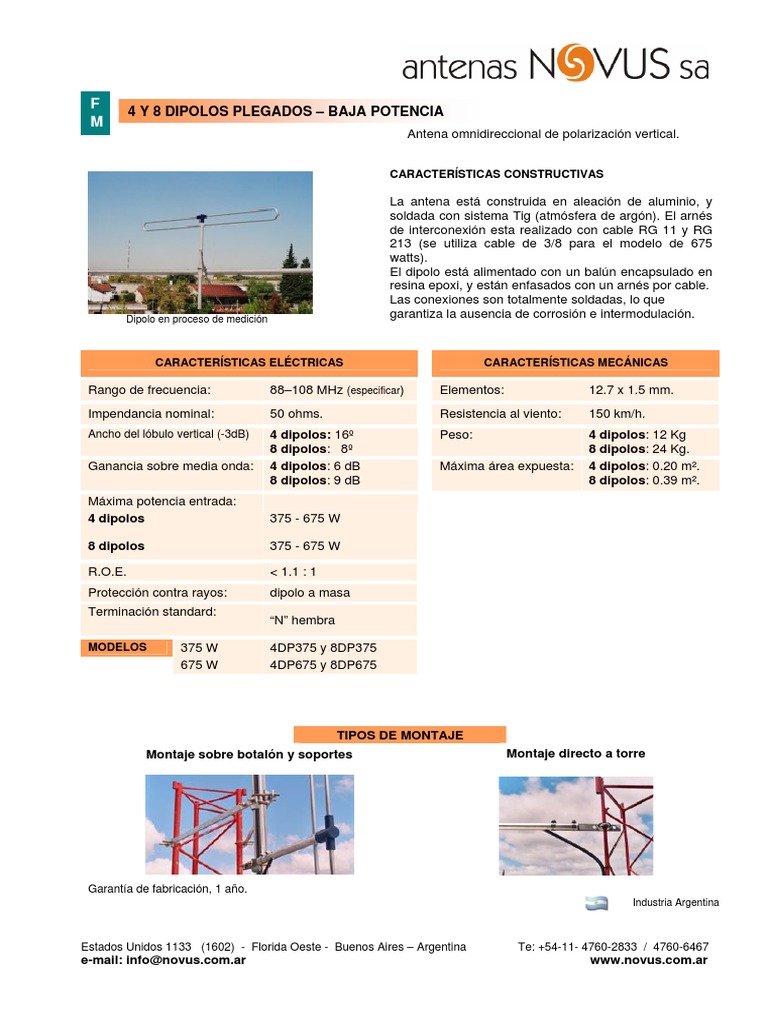La antena est construida en aleacin de aluminio, y soldada con sistema Tig (atmsfera de argn). El elemento irradiante es un dipolo plegado alimentado con un baln encapsulado en resina epoxi. Las conexiones son totalmente soldadas, lo que garantiza la ausencia de corrosin e intermodulacin. Incluye grampas de hierro galvanizado y dems accesorios de montaje. Se pueden enfasar dos o ms antenas mediante un arns. Se realiza el control en todas las unidades fabricadas. No requiere ajuste.