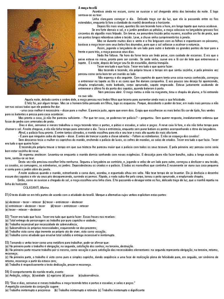 (d) Trabalho ininterrupto e incansvel (e) Trabalho ininterrupto e desgastante. 06) Mas tecendo e tecendo, ela prpria trouxe o tempo em que sentiu sozinha, e pela primeira vez pensou como seria bom ter um marido ao lado. E tecendo, ela prpria trouxe o tempo em que sua tristeza lhe pareceu maior que o palcio com todos os seus tesour os. E pela primeira vez pensou como seria bom estar sozinha de novo. Este dois momentos: (a) So concomitantes na vida da tecel e ela toma conscincia de sua solido; (b) so opostos enquanto o primeiro aponta para a tomada de conscincia de sua prpria frustrao e o segundo para a conscientizao de sua prpria solido; (c) o primeiro revela tomada de conscincia da prpria solido enquanto o segundo indica busca da auto-realizao; (d) embora em circunstncias diferentes, ambos os momentos nos mostram a tecel na solido na tentativa de se relacionar com o mundo; (e) se no primeiro momento encontramos a tecel tomando conscincia de sua prpria solido, partindo para a busca da realizao; no segundo momento, ns a encontramos num momento de frustrao e retorno ao princpio. 07) Assinale o provrbio que melhor resume o mensagem do texto: (a) Antes s do que mal acompanhado (b) Mais vale uma andorinha na mo do que duas voando (c) Uma andorinha s no faz vero (d) quem no ouve conselho ouve coitado(e) De pensar morreu um burro 08) Linha clara, pra comear o dia. Delicado trao cor da luz, que ela ia passando entre fios estendidos, enquanto l fora a claridade da manh desenhava o horizonte. (segundo pargrafo) Ento, como se ouvisse a chegada do sol, a moa escolheu uma linha clara. E foi passando-a devagar entre os fios, delicado trao de luz, que a manh repetiu na linha do horizonte. (ltimo pargrafo) Estes dois trechos indicam, exceto: (a) Clara inteno da autora de terminar o texto como havia comeado; (b) O trabalho da tecel concomitante ao trabalho da escritora: a moa tece l e a escritora tece palavras; (c) As tessituras (trabalho de tecer) so contnuas, sugerindo um crculo interminvel: a moa continuar escolhendo linhas escuras para tecer a noite, tecendo leite, tecendo peixe, tecendo o companheiro...; (d) Uma volta ao princpio, reencontro com a alegria, com a paz, com a simplicidade; (e) Retorno ao passado e a deciso de jamais tecer sua prpria vida. 09) Transforme o texto em um poema.