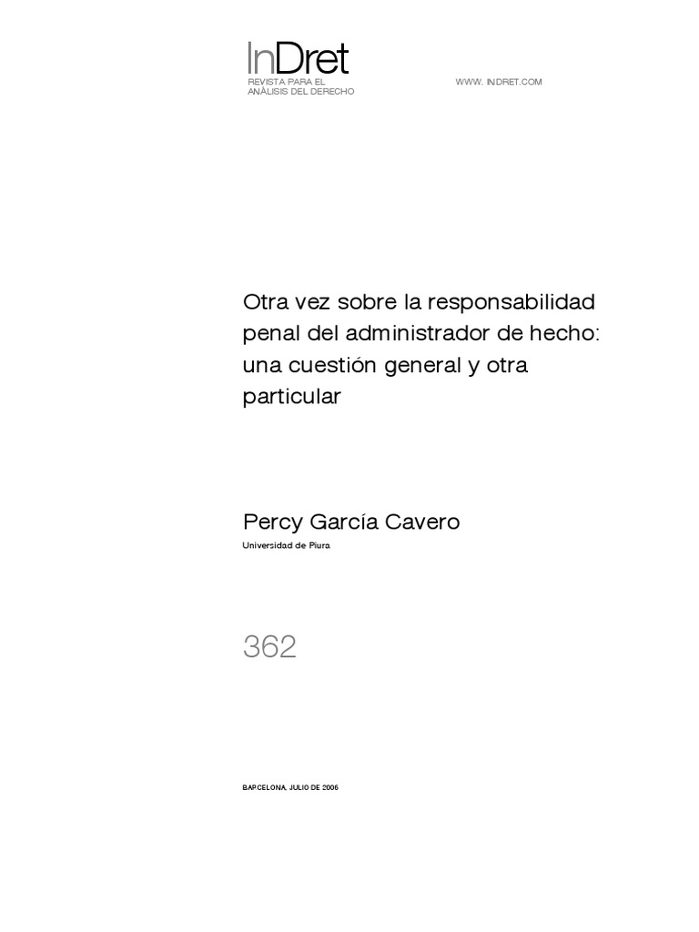 Lima.). Si se interpreta correctamente los puntos de partida de los delitos especiales de dominio. Luís GRACIA MARTÍN (2004). Elena NÚÑEZ CASTAÑO (2000). «El concepto jurídico-penal de acción». Günther JAKOBS (2004a). 11 . Bibliografía Percy GARCÍA CAVERO (2003). Cancio). Percy GARCÍA CAVERO (1999). Derecho penal económico. Cádiz. Leipziger Kommentar. en Modernas tendencias en la ciencia del Derecho penal y en la Criminología. Strafrecht. Aspectos dogmáticos y jurisprudenciales. Bogotá. (trad. La responsabilidad penal del administrador de hecho de la empresa: Criterios de imputación. se podrá apreciar que los críticos de mi propuesta de interpretación han sido víctimas de su propia mala comprensión de mis ideas. (trad. El administrador de hecho en los delitos societarios. Parte General. Jose Manuel RÍOS CORPACHO (2005). Madrid. Valencia. Corcoy Bidasolo (dr. Sobre la normativización de la dogmática jurídico-penal. (trad. en Estudios de Derecho penal. I. Revista Peruana de Doctrina y Jurisprudencia penales 5. Luís GRACIA MARTÍN (1985). Günther JAKOBS (1991). Barcelona. Madrid. «La normativización del Derecho penal en el ejemplo de la participación». Günther JAKOBS (2004b). Responsabilidad penal en la empresa. Günther JAKOBS (1997). Zaragoza. Valencia. Cancio). En el caso de la responsabilidad penal del administrador de hecho por el uso de un testaferro. Allgemeiner Teil die Grundlagen und die Zurechnungslehre. Los delitos societarios. 11. en Derecho penal de la empresa. Madrid. Lima. Aufl. 5. Bernd SCHÜNEMANN et al (1994). Estudios sobre los delitos de omisión. Estudios de Derecho penal. 2. Aufl. (trad. Patricia FARALDO CABANA (2000). Jesús María SILVA SÁNCHEZ (2004). Jose-Ignacio GALLEGO SOLER (2002). «El concepto de administrador de hecho como criterio de imputación de autoría en el Derecho penal».InDret 3/2006 Percy García idea del dominio sobre la propia esfera de organización. Sánchez Vera). Berlin. Cancio). «La intervención delictiva». Lima. Günther JAKOBS (1996). La imputación objetiva en el Derecho penal. El actuar en lugar de otro en Derecho penal. Walter de Gruyter. este administrador de hecho resulta siempre responsable a título de autor y no como simple partícipe. passim.. Pamplona. Berlin/New Jork. Günther JAKOBS (2001).