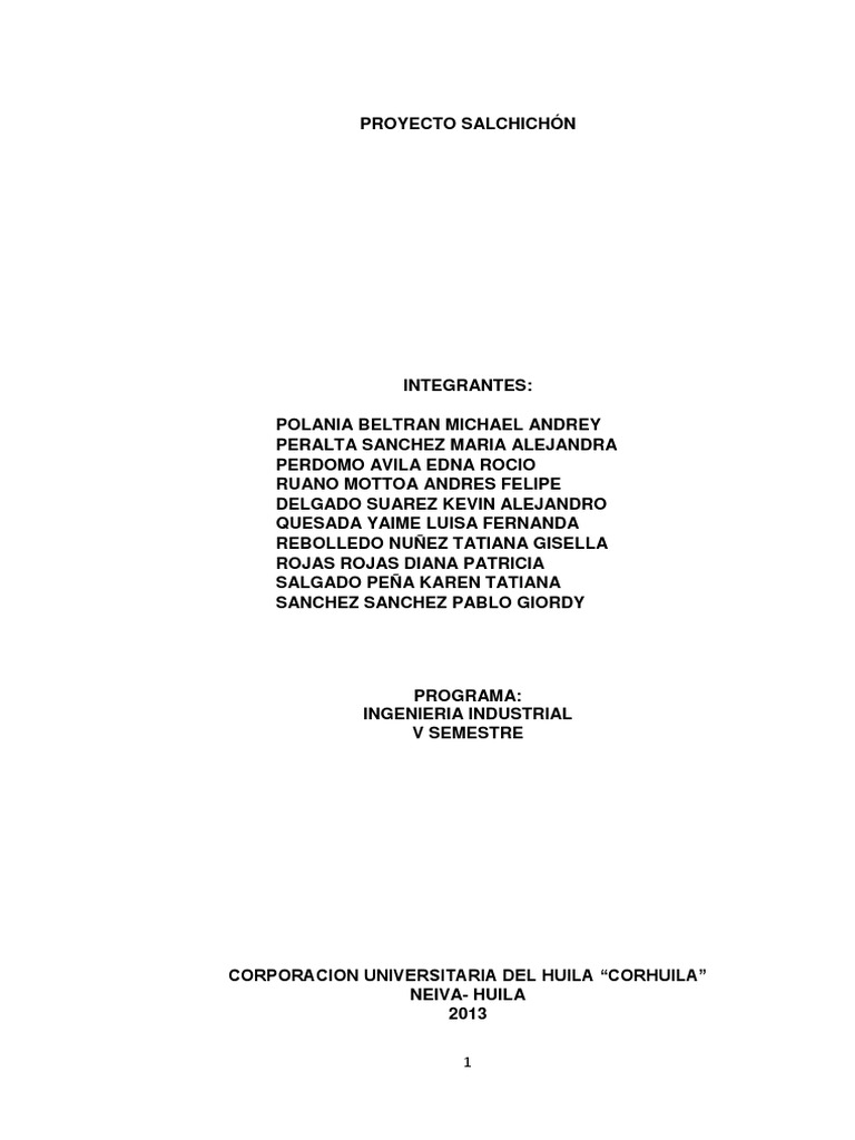 El presente trabajo es realizado a razn de explicar el proceso de elaboracin de productos crnicos a base de grasa de cerdo, carne de res y carne de cerdo como lo son las hamburguesas, chorizos y salchichones; sin ignorar el acatamiento de las normas de salubridad. La carne es un producto obtenido despus de sacrificar un animal ya sea vaca o cerdo, en la actividad en la industria crnica y el procesamiento de alimentos para el control de calidad, la carne es una fuente habitual de protenas generalmente colgeno o elastina, grasas y minerales en la dieta humana y es una mayor valoracin en los mercados. El salchichn se elabor con carne de cerdo, carne de res y grasa crudas que se somete a un proceso de maduracin y que se embute en una tripa fibrosa artificial; Todos los ingredientes fueron pesados y mezclados de acuerdo a porcentajes estrictos para obtener un producto final de calidad. Finalmente se obtuvo un producto con buenas caractersticas sensoriales a pesar dela tripa artificial. Los embutidos crnicos se definen como la carne picada condimentada con hierbas aromticas y diferentes especias (pimentn, pimienta, ajos, condimentos, etctera), es introducida ("embutida") en piel de tripas de cerdo o artificales dependiendo del producto a realizar. No falta resaltar la importancia del uso apropiado de los elementos de aseo personal al iniciar el laboratorio de crnicos (el gorro desechable, el tapabocas, calzado cerrado, pantaln largo, adems debemos estar sin maquillaje, sin accesorios, uas cortas y limpias ) en el sitio de trabajo para impedir que se expandan microorganismos no esperados.