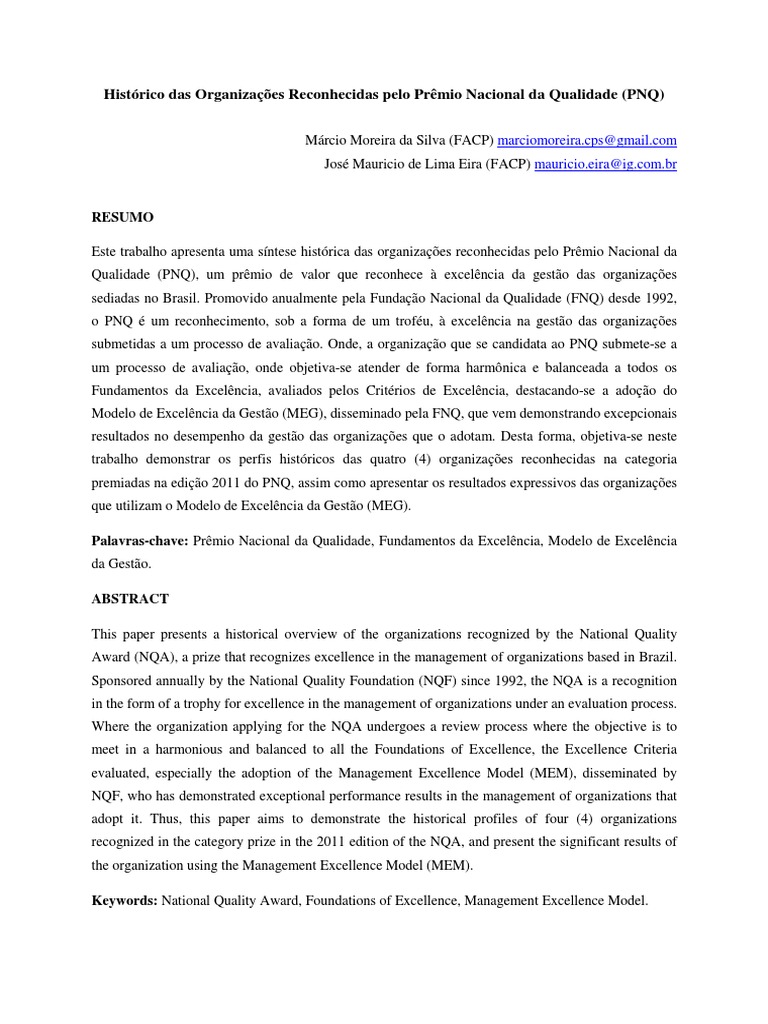 RESUMO Este trabalho apresenta uma sntese histrica das organizaes reconhecidas pelo Prmio Nacional da Qualidade (PNQ), um prmio de valor que reconhece excelncia da gesto das organizaes sediadas no Brasil. Promovido anualmente pela Fundao Nacional da Qualidade (FNQ) desde 1992, o PNQ um reconhecimento, sob a forma de um trofu, excelncia na gesto das organizaes submetidas a um processo de avaliao. Onde, a organizao que se candidata ao PNQ submete-se a um processo de avaliao, onde objetiva-se atender de forma harmnica e balanceada a todos os Fundamentos da Excelncia, avaliados pelos Critrios de Excelncia, destacando-se a adoo do Modelo de Excelncia da Gesto (MEG), disseminado pela FNQ, que vem demonstrando excepcionais resultados no desempenho da gesto das organizaes que o adotam. Desta forma, objetiva-se neste trabalho demonstrar os perfis histricos das quatro (4) organizaes reconhecidas na categoria premiadas na edio 2011 do PNQ, assim como apresentar os resultados expressivos das organizaes que utilizam o Modelo de Excelncia da Gesto (MEG). Palavras-chave: Prmio Nacional da Qualidade, Fundamentos da Excelncia, Modelo de Excelncia da Gesto. ABSTRACT This paper presents a historical overview of the organizations recognized by the National Quality Award (NQA), a prize that recognizes excellence in the management of organizations based in Brazil. Sponsored annually by the National Quality Foundation (NQF) since 1992, the NQA is a recognition in the form of a trophy for excellence in the management of organizations under an evaluation process. Where the organization applying for the NQA undergoes a review process where the objective is to meet in a harmonious and balanced to all the Foundations of Excellence, the Excellence Criteria evaluated, especially the adoption of the Management Excellence Model (MEM), disseminated by NQF, who has demonstrated exceptional performance results in the management of organizations that adopt it. Thus, this paper aims to demonstrate the historical profiles of four (4) organizations recognized in the category prize in the 2011 edition of the NQA, and present the significant results of the organization using the Management Excellence Model (MEM). Keywords: National Quality Award, Foundations of Excellence, Management Excellence Model.