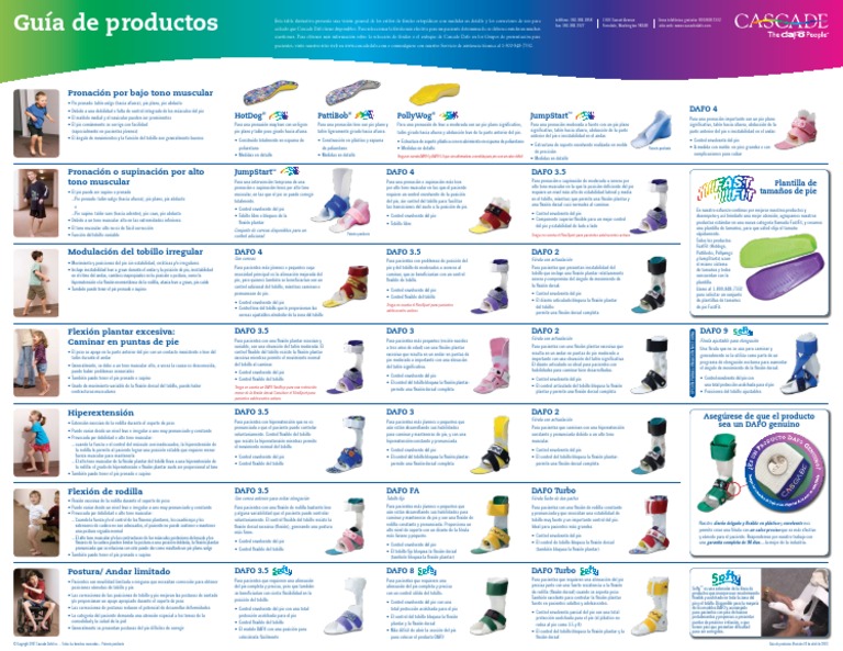 Esta tabla ilustrativa presenta una visin general de los estilos de frulas ortopdicas con medidas en detalle y los correctores de uso para calzado que Cascade Dafo tiene disponibles. Para seleccionar la frula ms efectiva para un paciente determinado, se deben consideran muchas cuestiones. Para obtener ms informacin sobre la seleccin de frulas o el enfoque de Cascade Dafo en los Grupos de presentacin para pacientes, visite nuestro sitio web en [Link] o comunquese con nuestro Servicio de asistencia tcnica al 1-800-848-7332.