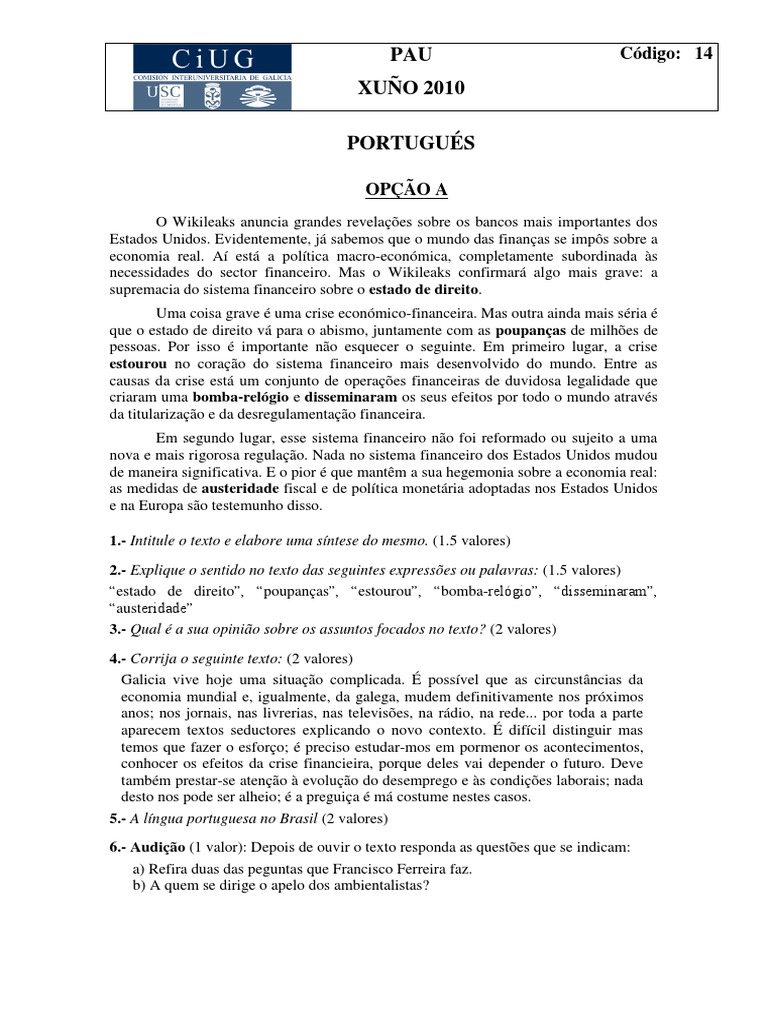 O Wikileaks anuncia grandes revelaes sobre os bancos mais importantes dos Estados Unidos. Evidentemente, j sabemos que o mundo das finanas se imps sobre a economia real. A est a poltica macro-econmica, completamente subordinada s necessidades do sector financeiro. Mas o Wikileaks confirmar algo mais grave: a supremacia do sistema financeiro sobre o estado de direito. Uma coisa grave uma crise econmico-financeira. Mas outra ainda mais sria que o estado de direito v para o abismo, juntamente com as poupanas de milhes de pessoas. Por isso importante no esquecer o seguinte. Em primeiro lugar, a crise estourou no corao do sistema financeiro mais desenvolvido do mundo. Entre as causas da crise est um conjunto de operaes financeiras de duvidosa legalidade que criaram uma bomba-relgio e disseminaram os seus efeitos por todo o mundo atravs da titularizao e da desregulamentao financeira. Em segundo lugar, esse sistema financeiro no foi reformado ou sujeito a uma nova e mais rigorosa regulao. Nada no sistema financeiro dos Estados Unidos mudou de maneira significativa. E o pior que mantm a sua hegemonia sobre a economia real: as medidas de austeridade fiscal e de poltica monetria adoptadas nos Estados Unidos e na Europa so testemunho disso. 1.- Intitule o texto e elabore uma sntese do mesmo. (1.5 valores) 2.- Explique o sentido no texto das seguintes expresses ou palavras: (1.5 valores) estado de direito, poupanas, estourou, bomba-relgio, disseminaram, austeridade 3.- Qual a sua opinio sobre os assuntos focados no texto? (2 valores) 4.- Corrija o seguinte texto: (2 valores) Galicia vive hoje uma situao complicada. possvel que as circunstncias da economia mundial e, igualmente, da galega, mudem definitivamente nos prximos anos; nos jornais, nas livrerias, nas televises, na rdio, na rede... por toda a parte aparecem textos seductores explicando o novo contexto. difcil distinguir mas temos que fazer o esforo; preciso estudar-mos em pormenor os acontecimentos, conhocer os efeitos da crise financieira, porque deles vai depender o futuro. Deve tambm prestar-se ateno evoluo do desemprego e s condies laborais; nada desto nos pode ser alheio; a preguia m costume nestes casos. 5.- A lngua portuguesa no Brasil (2 valores) 6.- Audio (1 valor): Depois de ouvir o texto responda as questes que se indicam: a) Refira duas das peguntas que Francisco Ferreira faz. b) A quem se dirige o apelo dos ambientalistas?