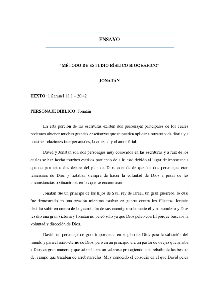 con Goliat, el filisteo gigante que retaba y humillaba al ejrcito del pueblo de Israel; David iba en el nombre de Dios de los ejrcitos y as venci al gigante decapitndolo con su propia espada. David lleg a ser un gran rey de Israel (las doce tribus de Israel), quiz el mejor de todos los tiempos y Dios le dio la promesa e hizo un pacto con l y con su reino, un linaje real sin fin, un trono y un reino para siempre. De su linaje vino el Cristo, el Salvador del mundo entero, Jesucristo al cual se le llama Hijo de David. En este ensayo del mtodo biogrfico he decidido que estudiemos y nos centremos en la vida de un solo personaje debido a la magnitud que abarcaramos estudiando a los dos personajes, as que solo hablaremos de Jonatn y trataremos de ampliar en cierta manera aspectos concernientes a su vida y persona, que nos ayudarn a comprender mejor su papel que desempe en las escrituras y a conocer de una manera ms profunda la vida de este personaje.