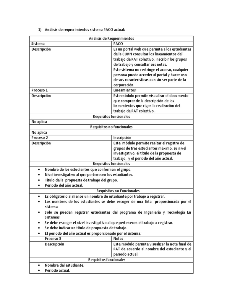 Anlisis de requerimientos PACO Portal web que debe permitir a los estudiantes de todos los programas acadmicos de la CURN consultar los lineamientos del trabajo de PAT colectivo, inscribir los grupos de trabajo y consultar sus notas. Nota: Se restringe el acceso al portal solo aquellos estudiantes que tienen cuenta de correo institucional; dicha cuenta de correo va asociada al nmero de identificacin del estudiante, as como al programa en que est matriculado acadmicamente adems al nivel investigativo al que este pertenece.