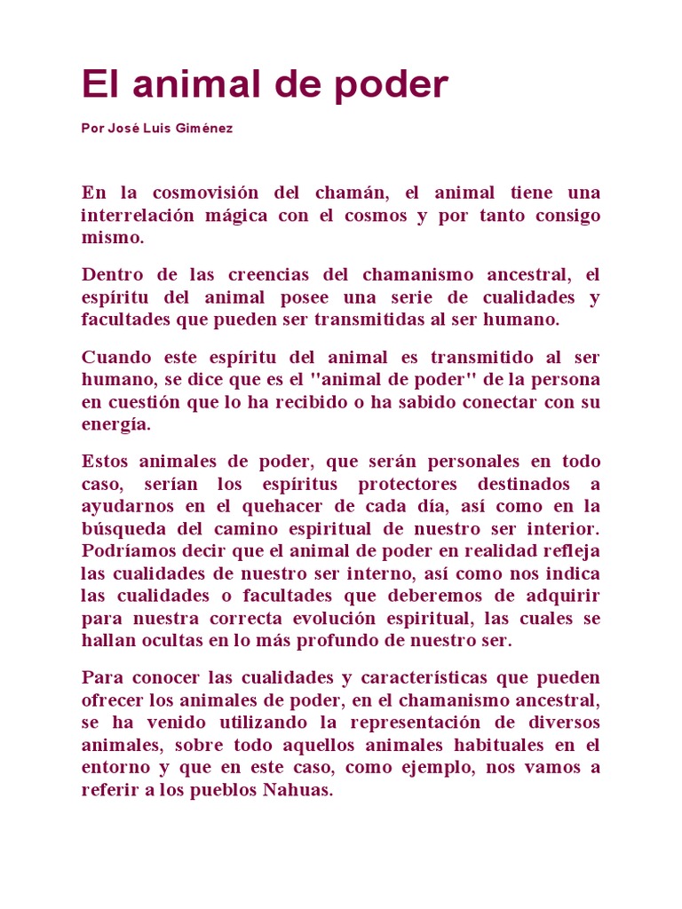%s, desde los chamanes ancestrales, se venia utili#ando las diferentes cualidades de los animales ms habituales, para designar que facultades debera desarrollar el ser humano como complemento a las cualidades propias, representadas todas las de la especie en un nico ser, el "&e'or de la especie". Este espritu o &e'or de la especie, ser quien se manifestar dentro del ser humano, mostrando todas las cualidades esenciales de la especie. %s ser el &e'or de los lobos, o el &e'or de las guilas, o el &e'or del "aguar, por poner un e"emplo, quien mostrar todas las cualidades de los animales correspondientes a su especie. Esta situacin se producir una ve# el su"eto se haya conectado de forma directa y particular con el espritu del animal de poder que le corresponde, a trav(s de diferentes t(cnicas o rituales. )na ve# se haya producido el contacto e identificacin del animal de poder, podr ser convocado en aquellas situaciones de peligro, dolor o solicitar su proteccin, apoyo y conse"o. !ero aunque aqu nos vamos a referir al concepto de animal de poder seg n los pueblos $ahuas, no debemos de olvidar de que este concepto es universal y que por tanto podremos encontrarlo en las diferentes culturas e*istentes en el mundo, con sus consecuentes variaciones. +oy da podemos ver como se adopta la figura de un determinado animal para representar a entidades de diversa ndole, desde clubes de f tbol, rugby o baloncesto ,los pumas de argentina, los b falos de EE.)).- a sociedades culturales , .eal /rden de los renos, /rden de
