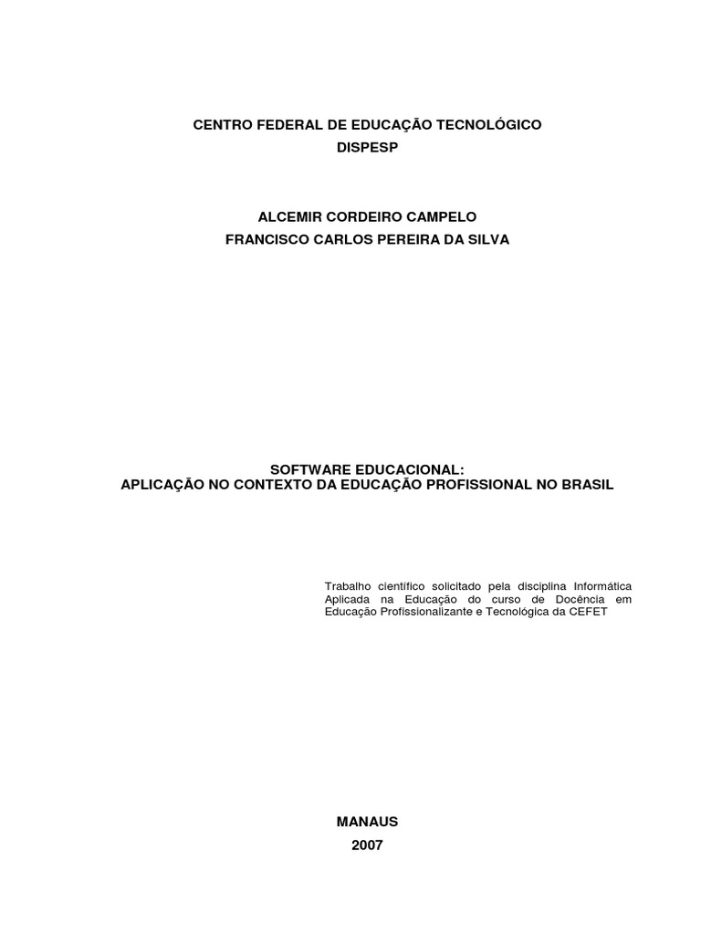 SOFTWARE EDUCACIONAL: APLICAO NO CONTEXTO DA EDUCAO PROFISSIONAL NO BRASIL Alcemir Cordeiro Campelo1 Francisco Carlos Pereira da Silva2 RESUMO