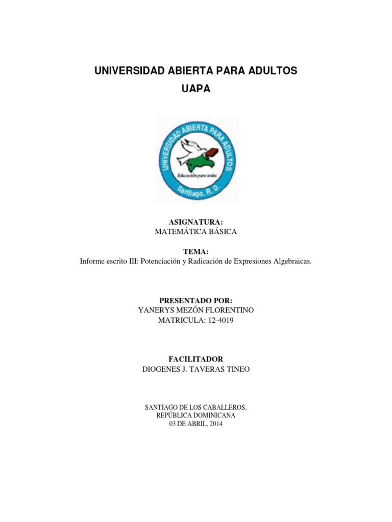 ASIGNATURA: MATEMTICA BSICA TEMA: Informe escrito III: Potenciacin y Radicacin de Expresiones Algebraicas.