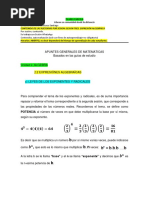 CUBO DE UN BINOMIO. En este caso se eleva la primera al cubo, ms tres veces la primera al cuadrado por la segunda, ms tres veces la primera por el cuadrado de la segunda, ms el cubo de la segunda cantidad, es decir: (x+y)3= x3+3x2y+3xy2+y3 PROPIEDADES DE LOS EXPONENTES. Estas son muy tiles para simplificar expresiones algebraicas, dentro de ellas tenemos: 1. Para multiplicar potencias de la misma base, se copia la misma base y se suman los exponentes. 2. Para elevar potencias de otras potencias, se copia la base y el exponente de esta se multiplica por la potencia. 3. La divisin de potencias de igual base, se copia la base y al exponente del dividendo se le resta el exponente del divisor. 4. Toda cantidad elevada a cero es igual a la unidad, siempre que la base no sea cero. 5. La potencia es distributiva respecto a la multiplicacin y divisin. 6. Toda potencia de exponente negativo es igual al inverso de la primera potencia con exponente positivo.