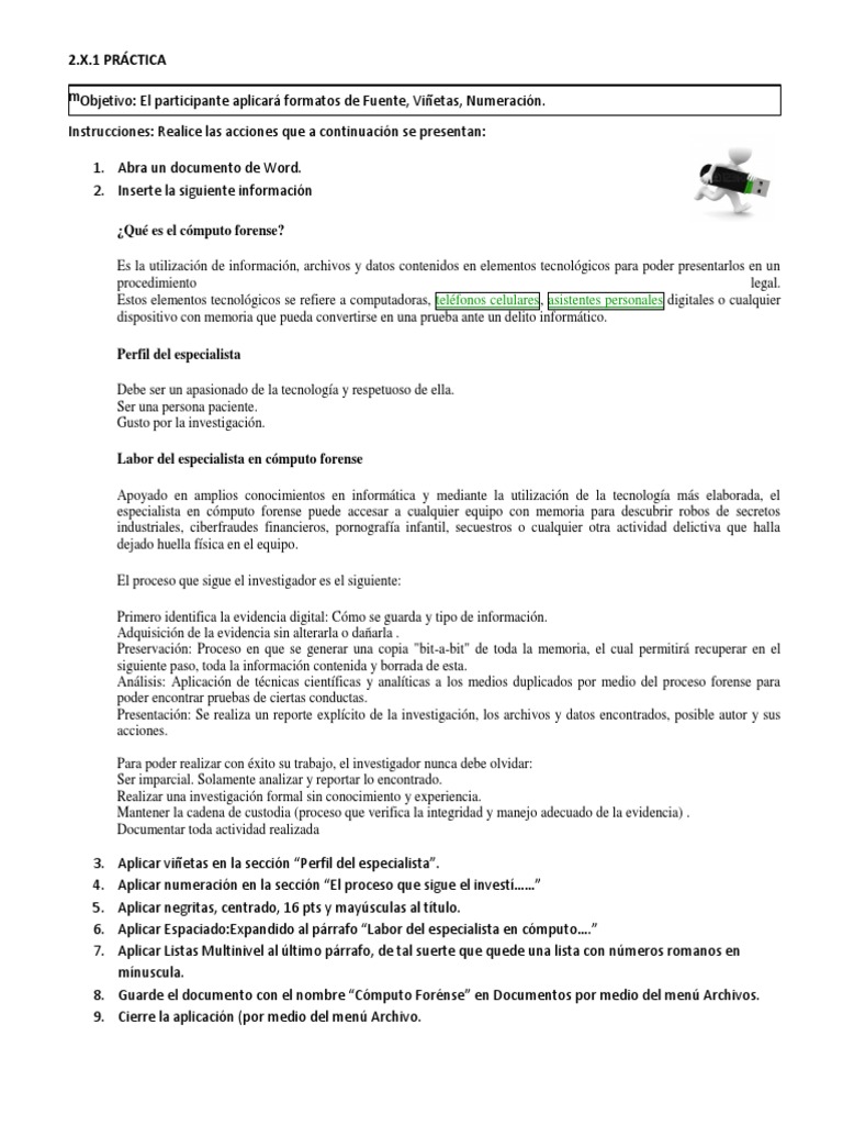 Aplicar vietas en la seccin Perfil del especialista. Aplicar numeracin en la seccin El proceso que sigue el invest Aplicar negritas, centrado, 16 pts y maysculas al ttulo. Aplicar Espaciado:Expandido al prrafo Labor del especialista en cmputo. Aplicar Listas Multinivel al ltimo prrafo, de tal suerte que quede una lista con nmeros romanos en mnuscula. 8. Guarde el documento con el nombre Cmputo Fornse en Documentos por medio del men Archivos. 9. Cierre la aplicacin (por medio del men Archivo.