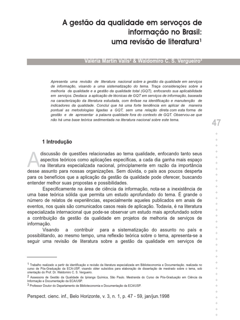 discusso de questes relacionadas ao tema qualidade, enfocando tanto seus aspectos tericos como aplicaes especficas, a cada dia ganha mais espao na literatura especializada nacional, principlamente em razo da importncia desse assunto para nossas organizaes. Sem dvida, o pas aos poucos desperta para os benefcios que a aplicao da gesto da qualidade pode oferecer, buscando entender melhor suas propostas e possibilidades. Especificamente na rea de cincia da informao, nota-se a inexistncia de uma base terica slida que permita um estudo aprofundado do tema. grande o nmero de relatos de experincias, especialmente aqueles publicados em anais de eventos, nos quais so comunicados casos reais de aplicao. Todavia, na literatura especializada internacional que pode-se observar um estudo mais aprofundado sobre a contribuio da gesto da qualidade em projetos de melhoria de servios de informao. Visando a contribuir para a sistematizao do assunto no pas e possibilitando, ao mesmo tempo, uma reflexo terica sobre o tema, apresenta-se a seguir uma reviso de literatura sobre a gesto da qualidade em servios de