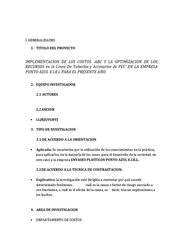 IMPLEMENTACION DE LOS COSTOS -ABC Y LA OPTIMIZACION DE LOS RECURSOS en la Lnea De Tuberas y Accesorios de [Link] LA EMPRESA PUNTO AZUL E.I.R.L PARA EL PRESENTE AO.