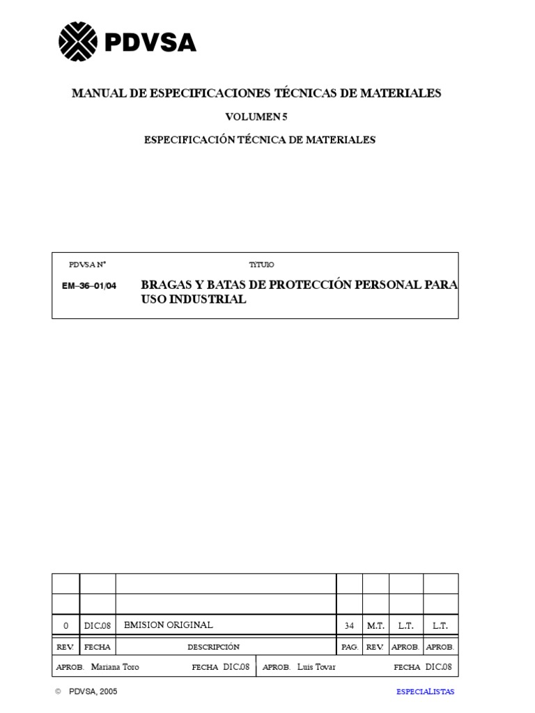 Esta especificacin establece las caractersticas tcnicas de los materiales, diseo, fabricacin y ensayos necesarios para la elaboracin de batas de laboratorio y bragas de seguridad de uso general, resistentes a la flama y para riesgos elctricos. Es aplicable en todas las instalaciones de todos los negocios y filiales de PDVSA, as como en aquellas empresas donde Petrleos de Venezuela tenga participacin mayoritaria en el Territorio Nacional. Estos lineamientos deben ser aplicados a trabajadores y trabajadoras permanentes, contratados y contratistas. Esta especificacin no contempla las bragas y batas de seguridad para trabajos en ambientes cidos, corrosivos, alcalinos, trabajos de soldadura y de combate de incendio.
