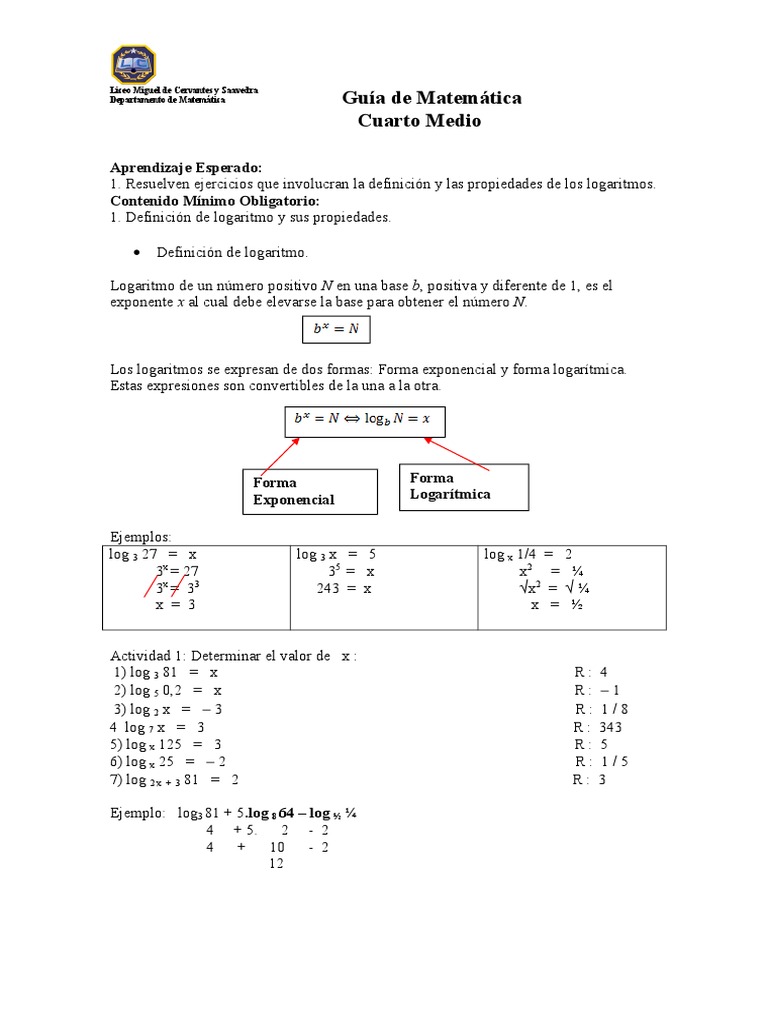 Aprendizaje Esperado: 1. Resuelven ejercicios que involucran la definicin y las propiedades de los logaritmos. Contenido Mnimo O ligatorio: 1. Definicin de logaritmo y sus propiedades. Definicin de logaritmo.