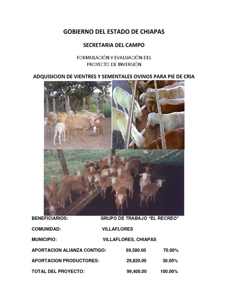 eficientar los recursos con que se dispone en el sector rural, sin que hasta la fecha los resultados en forma general, hayan sido satisfactorios. Independientemente de la generacin de nuevos paquetes tecnolgicos para la produccin agrcola, ganadera y forestal, en esta influyen otros factores externos, que impiden en muchas ocasiones se obtengan los rendimientos, ingresos y egresos esperados por los productores. La ovinocultura mexicana en los ltimos aos ha mostrado una dinmica interesante, que ha motivado a muchos productores a participar en ellas, ya que ha pasado de ser una actividad de ahorro familiar de autoconsumo a una actividad rentable, registrndose avances importantes, en el sector social. Chiapas es uno de los estados ms importantes del pas en la produccin ovina y el municipio de Villaflores, presenta condiciones para el desarrollo adecuado de este tipo de empresas. En lo que se refiere al municipio de Villaflores, la economa principal se refiere a la agricultura, cultivndose principalmente maz, cultivos bsicos, hortalizas y plantas con resultados favorables. En cuanto a la ganadera se localizan pequeas explotaciones de traspatio extensivas e intensivas de ganado bovino, ovino y porcino. 3.2.- Previsiones sin el Proyecto. La implementacin del proyecto de fomento a la ovinocultura, destaca el aprovechamiento integral de los recursos agro-ecolgicos con que cuentan los solicitantes, por lo que tendrn alternativas de fuente de ingresos, lo que tendr como consecuencia, un mejoramiento en sus niveles de vida. La realizacin de proyecto ser facilitado con la obtencin del apoyo con recursos del programa activos productivos, de la alianza para el campo, que completaran con sus recursos y que estn decididos a implementarlos, en caso de no ser favorecidos con la autorizacin de su proyecto, el grupo de cualquier manera lo iniciar, aunque en menor escala y que alcanzarn las metas del proyecto en un perodo de cinco aos. 4. ASPECTOS ORGANIZATIVOS 4.1.- Antecedentes. El grupo de trabajo EL RECREO del municipio de Villaflores, Chiapas, decidieron organizarse para la obtencin de apoyos econmicos por parte de la SAGARPA y de la SECRETARA DEL CAMPO, a travs de la Alianza para el Campo 2008, por lo que presenta el proyecto de inversin para la cra y explotacin de ganado ovino, como una alternativa de lograr tener un uso ms eficiente de sus recursos y aprovecharan esquimos agrcolas, reas de traspatio ociosas y mano de obra familiar.