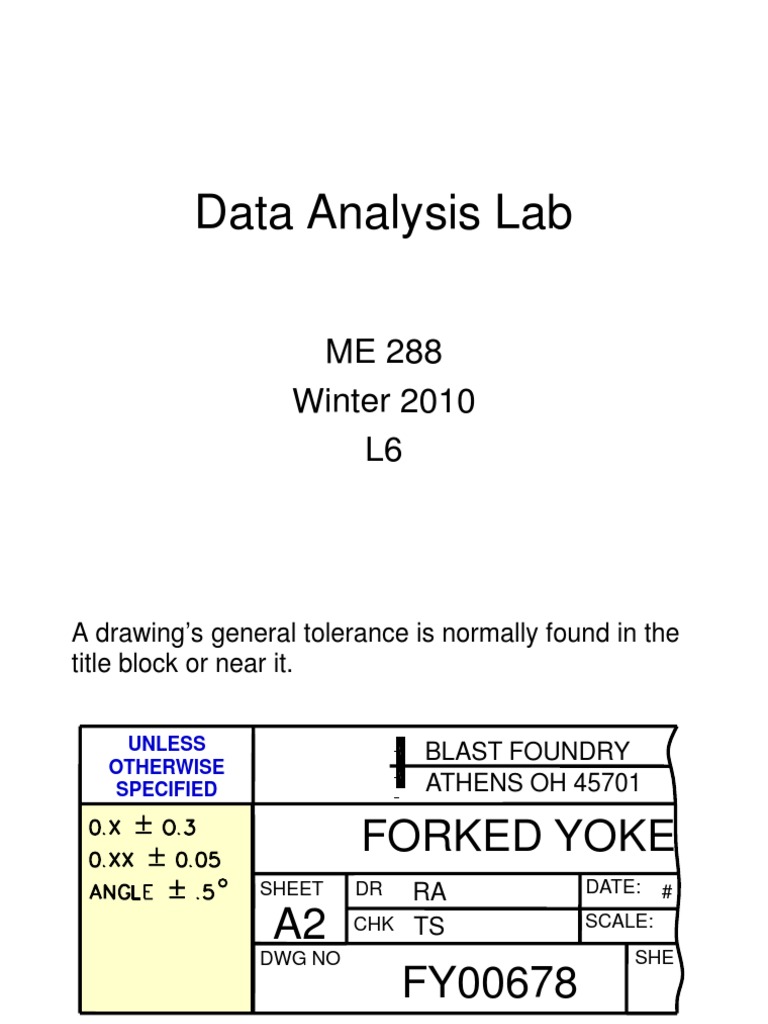 A drawing’s general tolerance is normally found in the title block or near it. UNLESS OTHERWISE SPECIFIED BLAST FOUNDRY ATHENS OH 45701 ± ± FORKED YOKE ± ° SHEET DR CHK A2 DWG NO RA TS DATE: SCALE: # FY00678 SHE .