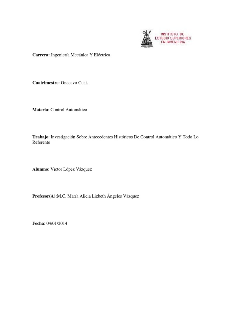 BIBLIOGRAFIA: KATSUHIKO OGATA, 1970 INGENIERIA DE CONTROL MODERNA PRENTICE HALL QUINTANILLA, M.A. Tecnologa un enfogue filosfico. EUDEBA, Buenos Aires, 1991. VAN GIGCH, J.P. Teora general de sistemas. Ed.Trillas, Mxico, 1995. B ALCELLS, J.; ROMERAL, J.R. Autmatas programabas. Ed. Marcombo, Barcelona, 1997. BOLTON, W. Instrumentacin y control industrial. Ed. Marcombo, Barcelona, 1996. D'AZZO, J.;HOUPIS, C. Sistemas lineales de control. Ed. Paraninfo, Madrid, 1977. DE ROSNAY, i. El macrosconio. Ed. AC, Madrid, 1984. http://linux0.unsl.edu.ar/~rvilla/c3m10/tema1.pdf http://catarina.udlap.mx/u_dl_a/tales/documentos/lep/nunez_e_f/capitulo1.pdf https://www.google.com.mx/url?sa=t&rct=j&q=&esrc=s&source=web&cd=13&cad=rja&v ed=0CDYQFjACOAo&url=http%3A%2F%2Futvm.edu.mx%2Finicio%2Fingenierias%2F mecatronica%2F3er%2520Cuatrimestre%2F2%2520Control%2520autom__tico.doc&ei=0 gPwUqywIend2QX23oHYCg&usg=AFQjCNFpM-mdhMNII2X5RpnH7Xs8d6C1zw http://books.google.com.mx/books?id=TVM1QoZmuAC&printsec=frontcover&dq=definicion+de+automatizacion&hl=es&sa=X&ei= Yg3wUsraDsPy2QXl6YHADA&ved=0CDoQ6AEwAQ#v=onepage&q=definicion%20de %20automatizacion&f=false http://materias.fi.uba.ar/7566/Automatizacion.pdf http://materias.fi.uba.ar/7609/material/Clase%2004/04%20b%20Analisis.pdf http://books.google.com.mx/books?id=TtMfuy6FNCcC&pg=PA1&dq=antecedentes+histor icos+del+control+automatico&hl=es&sa=X&ei=18nvUtqSEIXy2gXc6IAI&ved=0CFUQ6 AEwCA#v=onepage&q=antecedentes%20historicos%20del%20control%20automatico&f= false