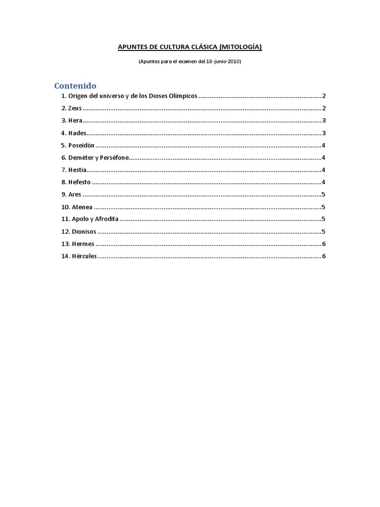 1. Origen del universo y de los Dioses Olmpicos ................................................................... 2 2. Zeus .................................................................................................................................. 2 3. Hera .................................................................................................................................. 3 4. Hades ................................................................................................................................ 3 5. Poseidn ........................................................................................................................... 4 6. Demter y Persfone......................................................................................................... 4 7. Hestia................................................................................................................................ 4 8. Hefesto ............................................................................................................................. 4 9. Ares .................................................................................................................................. 5 10. Atenea ............................................................................................................................ 5 11. Apolo y Afrodita .............................................................................................................. 5 12. Dionisos .......................................................................................................................... 5 13. Hermes ........................................................................................................................... 6 14. Hrcules .......................................................................................................................... 6