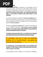 recuerdos - deseos reprimidos en la historia personal del suCeto. Hepresentara nuestra naturale3a propiamente animal. n su funcionamiento0 el llo /usca la descarga de la e2citacin0 la tensin o la energa. :e rige por el principio de placer. :e trata de una energa inconsciente $ue influ-e en la dinmica de la personalidad0 tratando de satisfacer los impulsos instinti*os de super*i*encia0 reproduccin - agresin0 - persiguiendo siempre su gratificacin inmediata. &uando estos impulsos son reprimidos por cual$uiera de las otras dos instancias0 el llo los refleCa a tra*8s de los sueIos o de los actos fallidos. l llo pertenece al inconsciente0 desde donde act9a so/re la conciencia pro*ocando dese$uili/rios - tensiones en el organismo. Pulsiones. 4Drie/5 es la pala/ra $ue !reud emplea - $ue de/emos traducir por 4pulsin50 - no por instinto. !reud entiende por pulsin el impulso pro*ocado por una energa $ue tiende a /uscar su satisfaccin mediante el o/Ceto adecuado. &uando esta 9ltima no se alcan3a0 el organismo permanece en tensin de/ido al empuCe del impulso no satisfecho. !reud distingui inicialmente dos tipos de pulsiones: las se2uales o 4libido5 ;en latn0 apetencia placentera> - las pulsiones de autoconser*acin. Las primeras se rigen por el principio del placerG las segundas0 por el de realidad. !reud dedic escasa atencin a las pulsiones de autoconser*acin por$ue0 a su Cuicio0 este impulso no puede dar lugar a trastornos neurticos0 -a $ue no puede ser ignorado ni desatendido. A partir de 1=#.0 de/ido a la e2periencia de la Primera Buerra 7undial0 !reud modifica su teora de las pulsiones. Las pulsiones de autoconser*acin - las se2uales se integran en una 9nica pulsin0 el 4 ros5 o 4principio de la *ida50 - aIade una pulsin nue*a0 la 4pulsin de muerte5 o 4autodestruccin0 4Dhanatos5. La agresi*idad pasa0 as0 a un plano primario0 lo $ue tendr importantes repercusiones en las consideraciones freudianas acerca de la cultura - la sociedad. Podemos0 pues0 compro/ar como !reud se aferr en todo momento a una concepcin dualista de las pulsiones. l Super ;Super-Ego> representa el aspecto moral de nuestro comportamiento ;normas e ideales morales> - aspira a eCercer un control so/re el Ao0 al modo como las normas morales aspiran a controlar el comportamiento. :u origen se remonta a la superacin del &ompleCo de dipo0 cuando el nio interiori3a las normas $ue el padre le transmite. l :uper- e$ui*ale a una especie de moral arcaica $ue resulta de la interiori3acin de las prohi/iciones familiares sociales ad$uiridas desde nuestra infancia. Hepresenta pautas ideales de conducta prohi/iciones o e2igencias socioculturales. :u misin fundamental es presionar al Ao0 seIalndole cmo de/era comportarse en cada momento0 pero tam/i8n generndole sentimientos de culpa cuando incumple sus e2igencias. l nio0 $ue primiti*amente es amoral0 empie3a a perci/ir las prohi/iciones familiares0 $ue terminan por interiori3arse0 hacerse inconscientes0 - con*ertirse en una instancia $ue *igila - amena3a al Ao. :eg9n !reud0 el :uper- tam/i8n es una estructura inconsciente. l !o ;Ego> es la instancia $ue media entre el llo - la realidad e2terior. :u funcin es llo en la medida $ue dicha