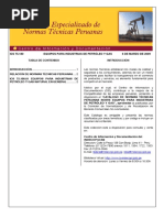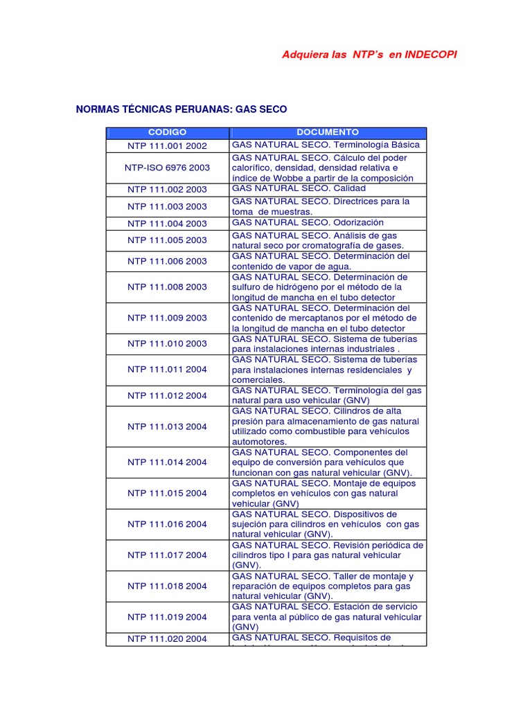 CODIGO NTP 111.001 2002 NTP-ISO 6976 2003 NTP 111.002 2003 NTP 111.003 2003 NTP 111.004 2003 NTP 111.005 2003 NTP 111.006 2003 NTP 111.008 2003 DOCUMENTO GAS NATURAL SECO. Terminologa Bsica GAS NATURAL SECO. Clculo del poder calorfico, densidad, densidad relativa e ndice de Wobbe a partir de la composicin GAS NATURAL SECO. Calidad GAS NATURAL SECO. Directrices para la toma de muestras. GAS NATURAL SECO. Odorizacin GAS NATURAL SECO. Anlisis de gas natural seco por cromatografa de gases. GAS NATURAL SECO. Determinacin del contenido de vapor de agua. GAS NATURAL SECO. Determinacin de sulfuro de hidrgeno por el mtodo de la longitud de mancha en el tubo detector GAS NATURAL SECO. Determinacin del contenido de mercaptanos por el mtodo de la longitud de mancha en el tubo detector GAS NATURAL SECO. Sistema de tuberas para instalaciones internas industriales . GAS NATURAL SECO. Sistema de tuberas para instalaciones internas residenciales y comerciales. GAS NATURAL SECO. Terminologa del gas natural para uso vehicular (GNV) GAS NATURAL SECO. Cilindros de alta presin para almacenamiento de gas natural utilizado como combustible para vehculos automotores. GAS NATURAL SECO. Componentes del equipo de conversin para vehculos que funcionan con gas natural vehicular (GNV). GAS NATURAL SECO. Montaje de equipos completos en vehculos con gas natural vehicular (GNV) GAS NATURAL SECO. Dispositivos de sujecin para cilindros en vehculos con gas natural vehicular (GNV). GAS NATURAL SECO. Revisin peridica de cilindros tipo I para gas natural vehicular (GNV). GAS NATURAL SECO. Taller de montaje y reparacin de equipos completos para gas natural vehicular (GNV). GAS NATURAL SECO. Estacin de servicio para venta al pblico de gas natural vehicular (GNV) GAS NATURAL SECO. Requisitos de instalacin, operacin y mantenimiento de