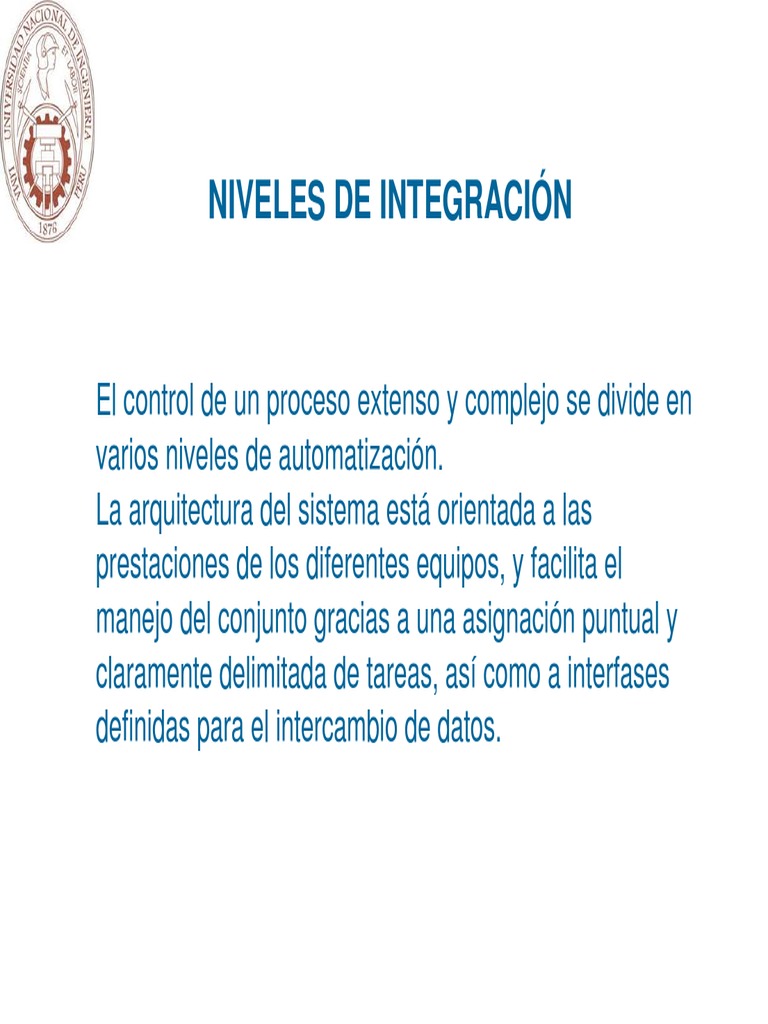 El control de un proceso extenso y complejo se divide en varios niveles de automatizacin. La arquitectura del sistema est orientada a las prestaciones de los diferentes equipos, y facilita el manejo del conjunto gracias a una asignacin puntual y claramente delimitada de tareas, as como a interfases definidas para el intercambio de datos.