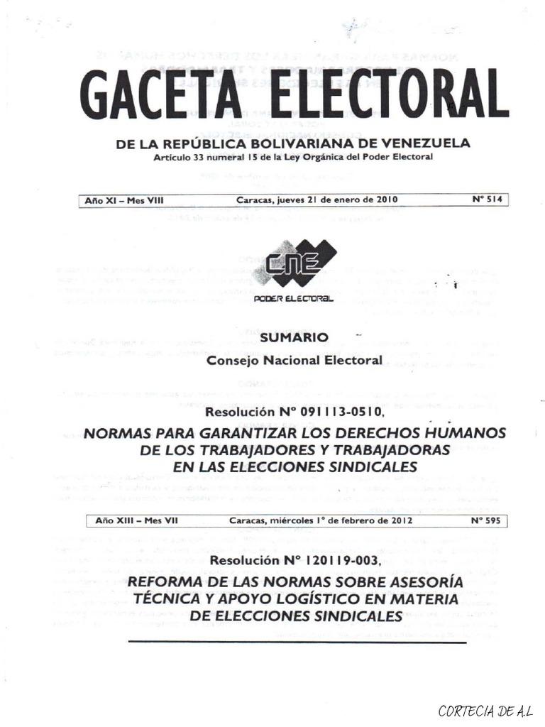 las elecciones sindicales, contenidas en la Resolucin N 090528-0265, publicada en la Gaceta Electoral