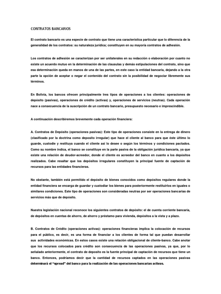 En Bolivia, los bancos ofrecen principalmente tres tipos de operaciones a los clientes: operaciones de depsito (pasivas), operaciones de crdito (activas) y, operaciones de servicios (neutras). Cada operacin nace a consecuencia de la suscripcin de un contrato bancario, presupuesto necesario e imprescindible.