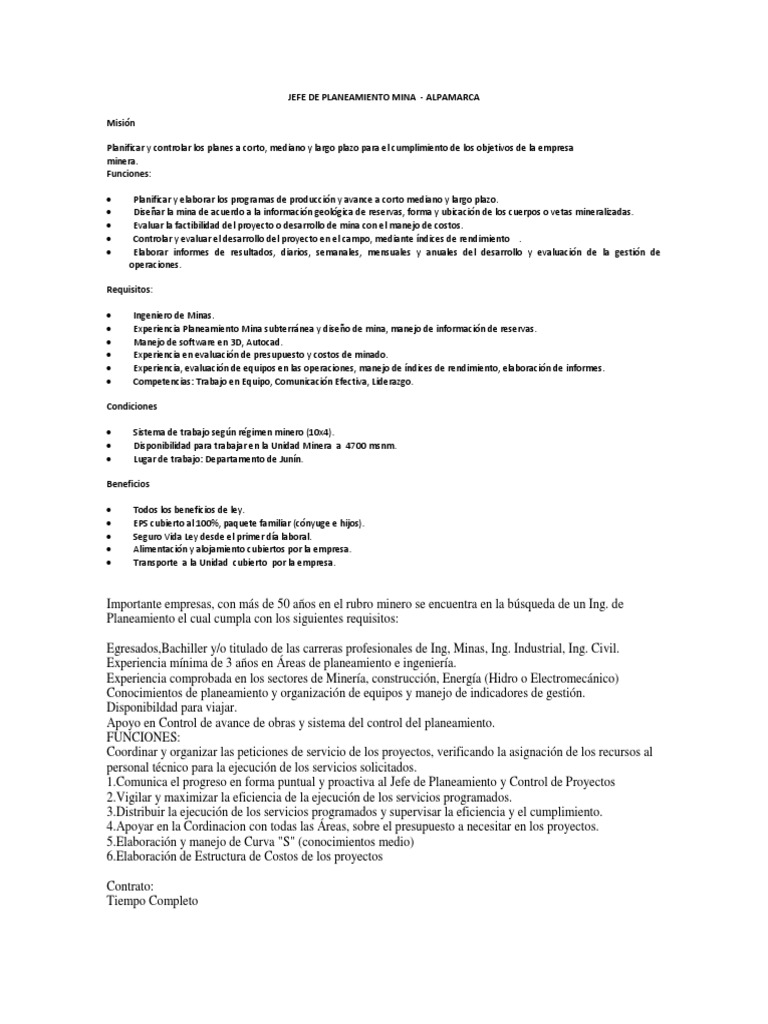 JEFE DE PLANEAMIENTO MINA - ALPAMARCA
