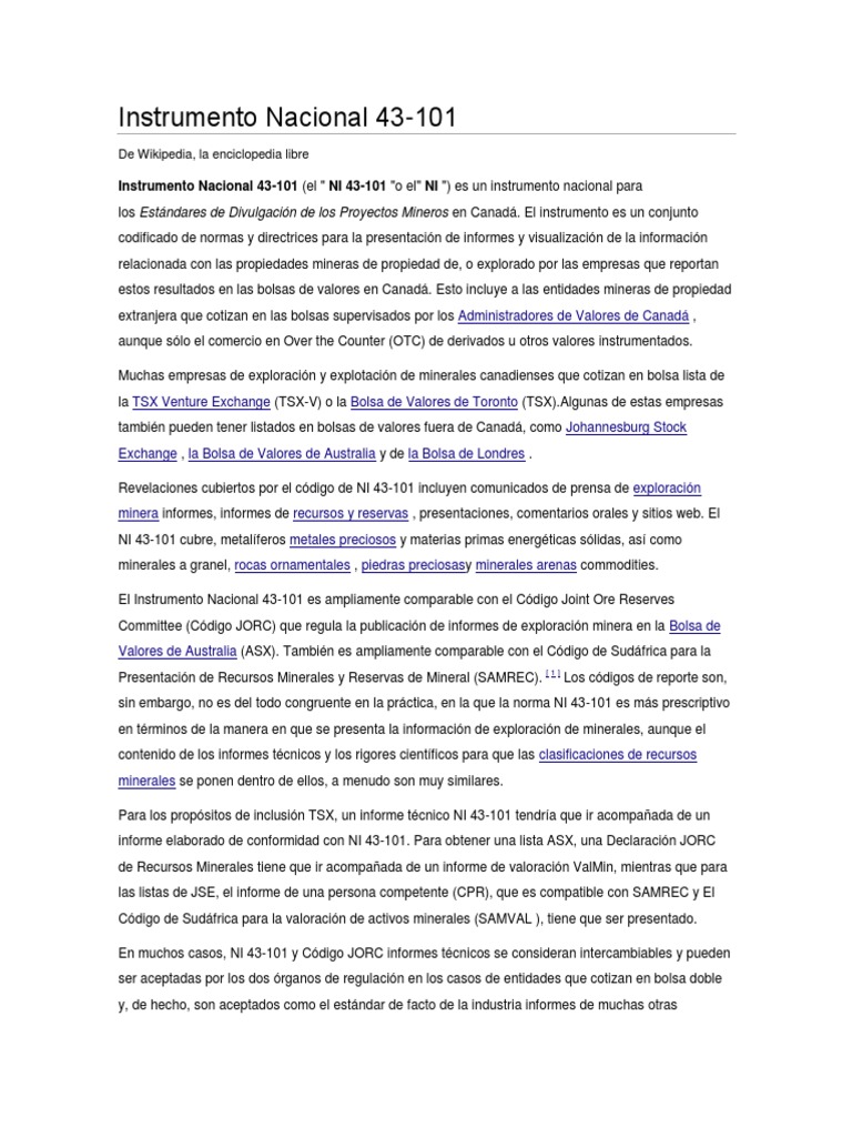 Instrumento Nacional 43-101 (el " NI 43-101 "o el" NI ") es un instrumento nacional para