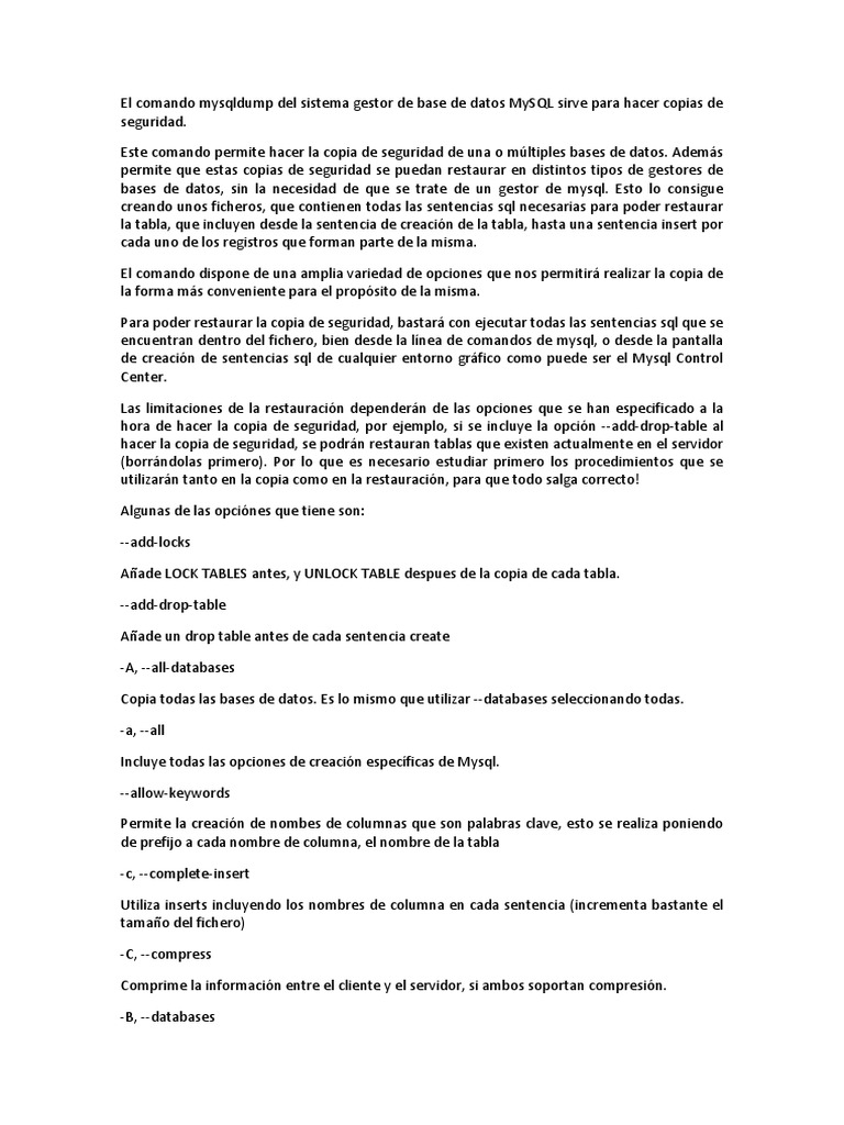 Este comando permite hacer la copia de seguridad de una o mltiples bases de datos. Adems