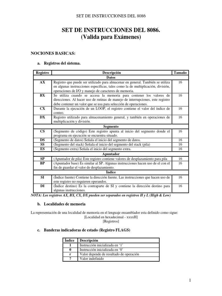 NOTA: Los registros AX, BX, CX, DX pueden ser separados en registros H y L (High & Low)