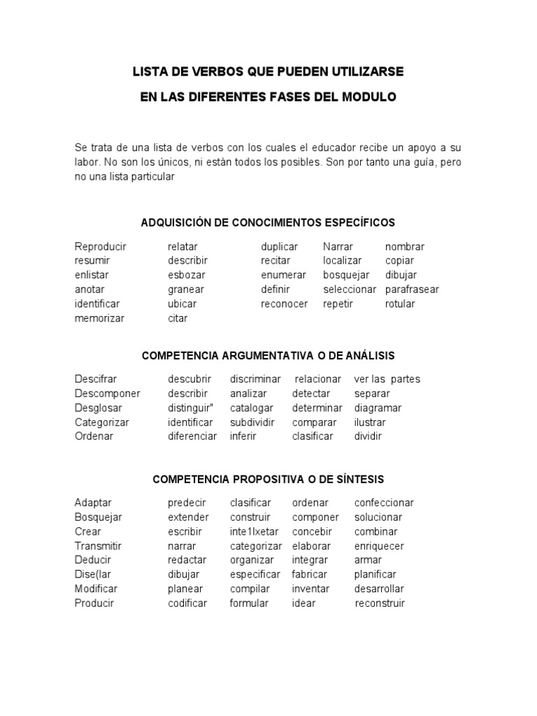 Se trata de una lista de verbos con los cuales el educador recibe un apoyo a su