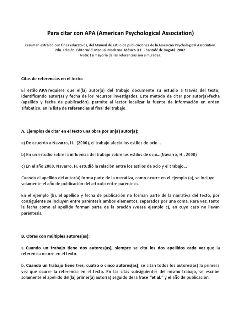 Resumen extrado con fines educativos, del Manual de estilo de publicaciones de la American Psychological Association.