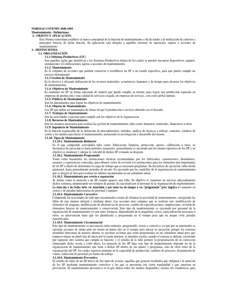 Esta Norma venezolana establece el marco conceptual de la funcin de mantenimiento a fin de tender a la unificacin de criterios y