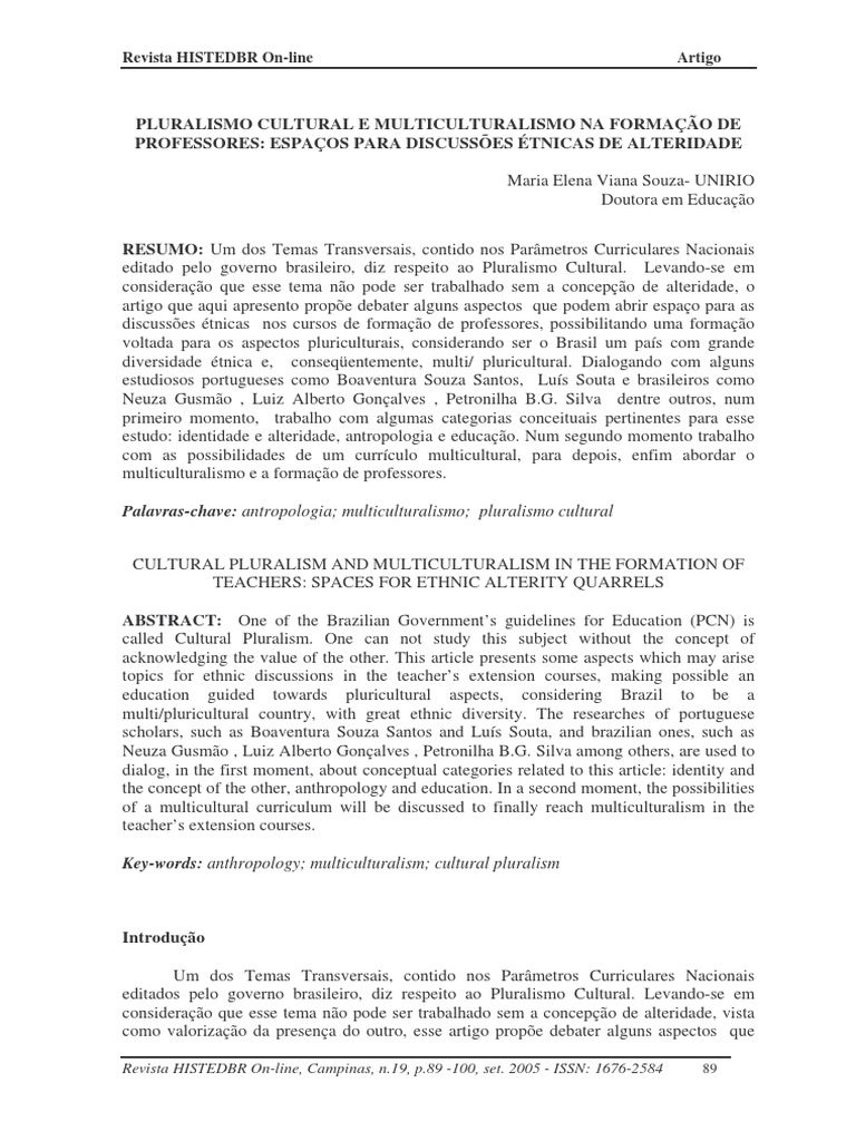 Palavras-chave: antropologia; multiculturalismo; pluralismo cultural