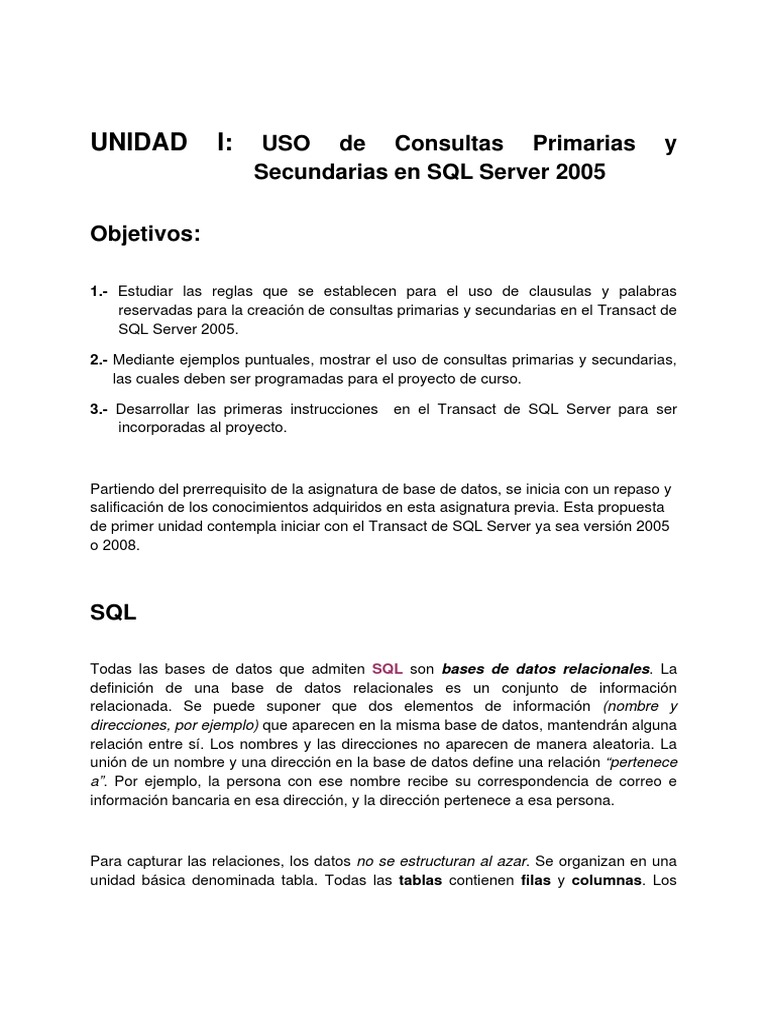 de primer unidad contempla iniciar con el Transact de SQL Server ya sea versión 2005