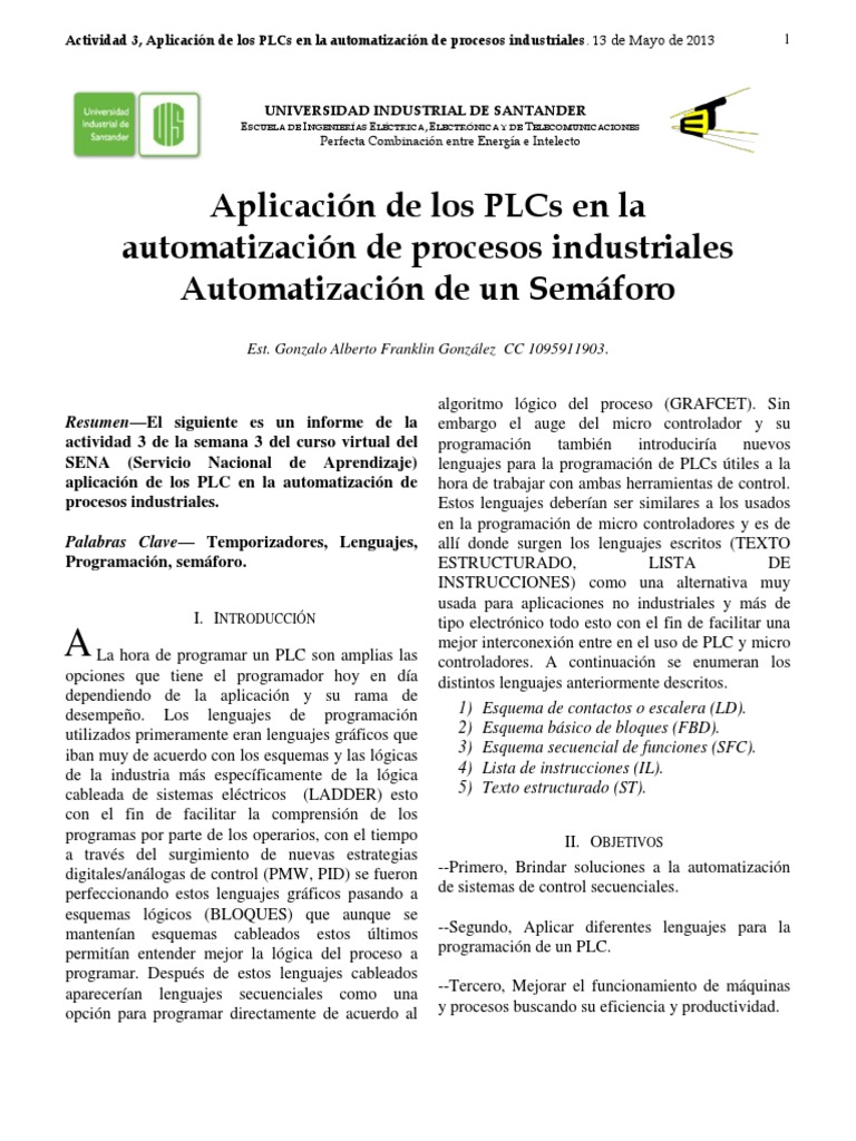 Actividad 3, Aplicacin de los PLCs en la automatizacin de procesos industriales. 13 de Mayo de 2013