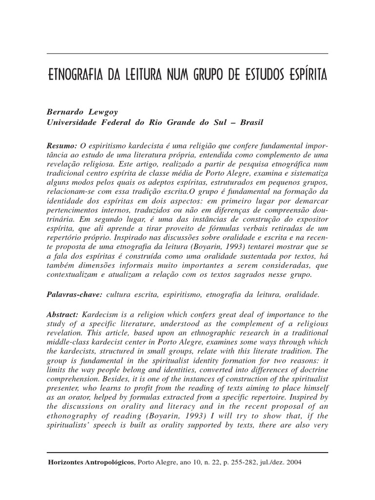 Horizontes Antropolgicos, Porto Alegre, ano 10, n. 22, p. 233-254, jul./dez. 2004 Da lio de escritura ETNOGRAFIA DA LEITURA NUM GRUPO DE ESTUDOS ESPRITA Bernardo Lewgoy Universidade Federal do Rio Grande do Sul Brasil Resumo: O espiritismo kardecista uma religio que confere fundamental impor- tncia ao estudo de uma literatura prpria, entendida como complemento de uma revelao religiosa. Este artigo, realizado a partir de pesquisa etnogrfica num tradicional centro esprita de classe mdia de Porto Alegre, examina e sistematiza alguns modos pelos quais os adeptos espritas, estruturados em pequenos grupos, relacionam-se com essa tradio escrita.O grupo fundamental na formao da identidade dos espritas em dois aspectos: em primeiro lugar por demarcar pertencimentos internos, traduzidos ou no em diferenas de compreenso dou- trinria. Em segundo lugar, uma das instncias de construo do expositor esprita, que ali aprende a tirar proveito de frmulas verbais retiradas de um repertrio prprio. Inspirado nas discusses sobre oralidade e escrita e na recen- te proposta de uma etnografia da leitura (Boyarin, 1993) tentarei mostrar que se a fala dos espritas construda como uma oralidade sustentada por textos, h tambm dimenses informais muito importantes a serem consideradas, que contextualizam e atualizam a relao com os textos sagrados nesse grupo. Palavras-chave: cultura escrita, espiritismo, etnografia da leitura, oralidade. Abstract: Kardecism is a religion which confers great deal of importance to the study of a specific literature, understood as the complement of a religious revelation. This article, based upon an ethnographic research in a traditional middle-class kardecist center in Porto Alegre, examines some ways through which the kardecists, structured in small groups, relate with this literate tradition. The group is fundamental in the spiritualist identity formation for two reasons: it limits the way people belong and identities, converted into differences of doctrine comprehension. Besides, it is one of the instances of construction of the spiritualist presenter, who learns to profit from the reading of texts aiming to place himself as an orator, helped by formulas extracted from a specific repertoire. Inspired by the discussions on orality and literacy and in the recent proposal of an ethonography of reading (Boyarin, 1993) I will try to show that, if the spiritualists speech is built as orality supported by texts, there are also very Horizontes Antropolgicos, Porto Alegre, ano 10, n. 22, p. 255-282, jul./dez. 2004 256 Srgio F. Ferretti Horizontes Antropolgicos, Porto Alegre, ano 10, n. 22, p. 255-282, jul./dez. 2004 Bernardo Lewgoy important informal dimensions to be considered which contextualize and update these groups relation with sacred texts. Keywords: ethnography of reading, literacy, oral communication, spiritualism. Religio de letrados, o espiritismo kardecista confere um status diferenciado ao lado da caridade e de suas prticas rituais leitura e interpretao de uma bibliografia religiosa prpria, que se inicia com a chamada Terceira Revelao ou Codificao de Allan Kardec, e que funciona como fonte de autoridade religiosa e constituio de identidades. 1 Socializar-se no espiritismo significa familiarizar-se, estudar, falar bastante sobre os autores e obras cannicas, ou seja, ingressar num universo de debate e reflexo dominado por uma tradio religiosa escrita e letrada, permeado por uma oralidade secundria no sentido de Ong (1982). A par dessa percepo da importncia da cultura letrada no espiritismo, observei por um ano e meio um grupo de estudos num tradicional centro esprita, situado num bairro de classe mdia, prximo ao centro de Porto Alegre. O texto a seguir uma etnografia da leitura entre espritas, que segue a inspirao de J onathan Boyarin (1993) e acompanha uma trajetria de discusso relacionada temtica da oralidade e da escrita (Goody, 1987, 1988; Havelock, 1996a, 1996b; Olson, 1997; Ong, 1982) no universo religioso. Indicaes bibliogrficas como ritos de autoridade Para as finalidades de nossa discusso, convm salientar que as indicaes bibliogrficas que os espritas me faziam serviram no exatamente para estabelecer um recorte, mas para a prpria introduo do pesquisador em campo. Ser iniciado , em primeiro lugar, receber 1 O espiritismo kardecista delimita-se pela referncia s obras de Kardec, basicamente O Livro dos Espritos, O Livro dos Mdiuns, O Evangelho Segundo o Espiritismo, A Gnese e O Cu e o Inferno, apelidados de o pentateuco kardequiano (Kardec, 1982, 1984, 1991a, 1991b, 1997). A denominao obras bsicas abrange os trs primeiros ttulos do conjunto, mas por serem consideradas pelos espritas como formando a base essencial da Codificao, esta formada pelo conjunto da obra de Kardec. O Livro dos Espritos a referncia bsica de leitura para os grupos de estudos, em conjunto com cartilhas didticas preparadas pela Federao Esprita Brasileira (FEB). 257 Sincretismo afro-brasileiro e resistncia cultural Horizontes Antropolgicos, Porto Alegre, ano 10, n. 22, p. 255-282, jul./dez. 2004 Etnografia da leitura num grupo de estudos esprita orientaes de leitura, como um principiante, qualquer que seja o pretexto para a aproximao. H, no espiritismo, uma hierarquizao estabelecida que presume no tanto a desigualdade de saberes, mas a desigualdade de esclarecimentos entre os espritas e os no-espritas. Quando fui comprar o Livro dos Espritos pela primeira vez, no posto de venda de livros da Sociedade Esprita Allan Kardec (a mais antiga sociedade esprita de Porto Alegre, de 1894), um senhor advertiu-me que eu deveria comprar as trs obras bsicas se eu quisesse estudar Kardec, que no adiantava eu comprar s uma porque elas formavam uma unidade. Essas orientaes espontneas so comuns nesse ambiente, encaradas como um dever daqueles que tm mais tempo de espiritismo. Se a idia de uma hierarquia de potencial 2 funcionava como um critrio de diferenciao interna entre os espritas, a antigidade na doutrina tambm era usada p
