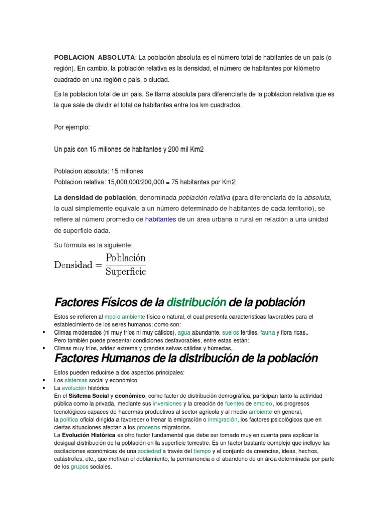 La densidad de poblacin, denominada poblacin relativa (para diferenciarla de la absoluta,