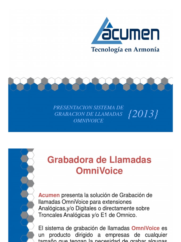 El documento presenta el sistema de grabación de llamadas OmniVoice de Acumen, el cual permite grabar llamadas de entrada, salida e interextensiones de empresas de cualquier tamaño. OmniVoice puede grabar extensiones analógicas y digitales, así como troncales analógicas y E1, almacenando hasta 2,500 horas de grabación. El sistema incluye módulos para procesar llamadas, visualizar grabaciones y generar reportes, y permite la administración remota a través de una interfaz en Windows.