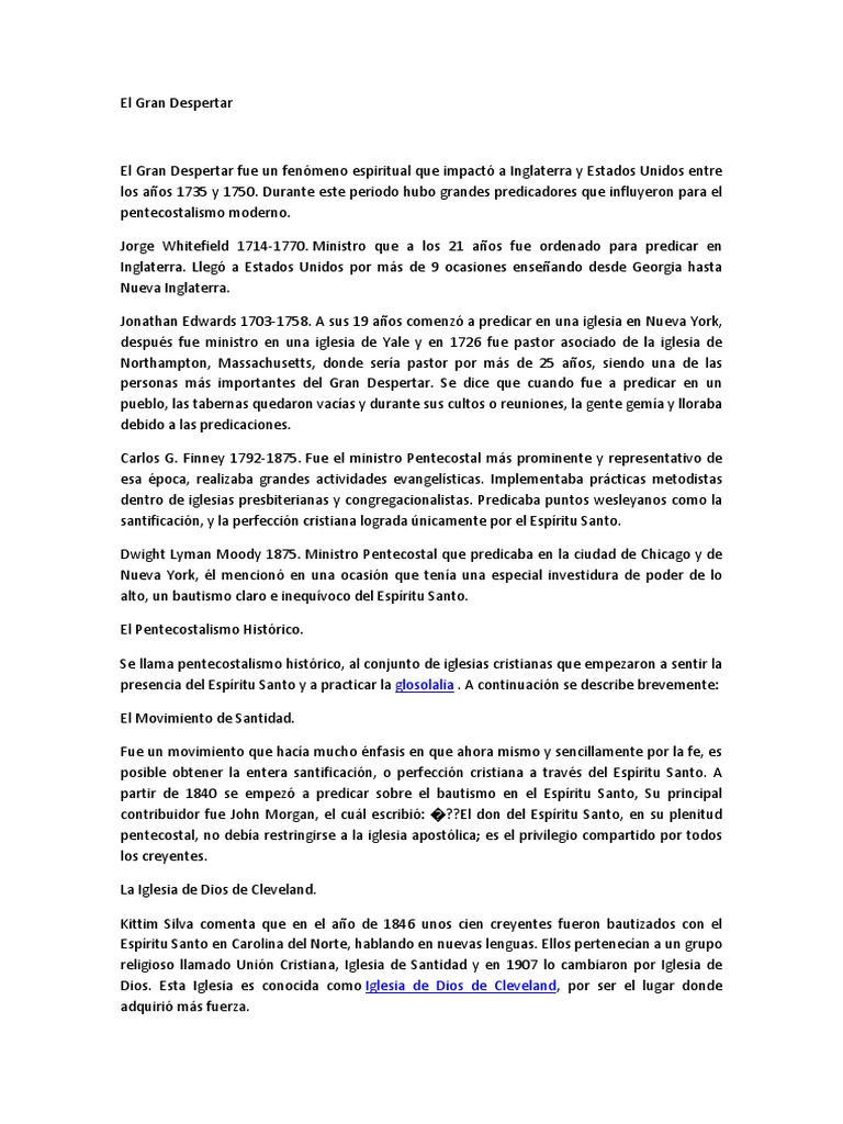 El Gran Despertar fue un fenmeno espiritual que impact a Inglaterra y Estados Unidos entre