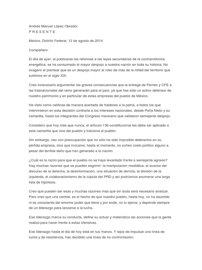 Andrés Manuel López Obrador P R E S E N T E México, Distrito Federal, 12 de agosto de 2014 Compañero: El día de ayer, al publicarse las reformas a las leyes secundarias de la contrarreforma energética, se ha consumado el mayor despojo a nuestra nación en toda su historia. No exagero al plantear que es un despojo mayor al robo de más de la mitad del territorio que sufrimos en el siglo XIX. Creo innecesario argumentar las graves consecuencias que la entrega de Pemex y CFE a las trasnacionales del ramo generarán para el país, ya que has sido un activo defensor de nuestro patrimonio y en particular de estas empresas del pueblo de México. He visto como calificas de manera acertada de traidores a la patria, a todos los que intervinieron en esta decisión contraria a los intereses nacionales, desde Peña Nieto y su camarilla, hasta los integrantes del Congreso mexicano que validaron semejante despojo. Considero que hoy más que nunca, el artículo 136 constitucional les debe ser aplicado a esta camarilla que vive del pueblo y traiciona al pueblo- Sin embargo, veo con preocupación que no sólo ha sido imposible detenerlos en su pérfida empresa, sino que inclusive, hasta el momento, no sufren costo político alguno a pesar del terrible daño que han generado a la nación. ¿Cuál es la razón para que el pueblo no se haya levantado frente a semejante agravio? Hay muchas razones que se pueden esgrimir: la manipulación mediática, el avance del discurso de la derecha, la desinformación, una situación de derrota, la división de la izquierda, el colaboracionismo de la cúpula del PRD y así podríamos enumerar una larga lista de hipótesis. Creo que pueden ser esas y muchas razones más que sin duda será necesario analizar. Pero creo que una central, es el hecho de que nuestro pueblo, hasta hoy, no ha asumido ni es consciente del enorme poder que tiene y por ende, no lo ejerce, y depende siempre de un liderazgo para lanzarse a la lucha. Ese liderazgo marca su conducta, define su actuar y materializa las acciones que la gente realiza para hacer frente a estas ofensivas. Ese liderazgo hasta el día de hoy está en tus manos. Y lejos de impulsar una línea de lucha y de resistencia, has decidido una línea de no confrontación.