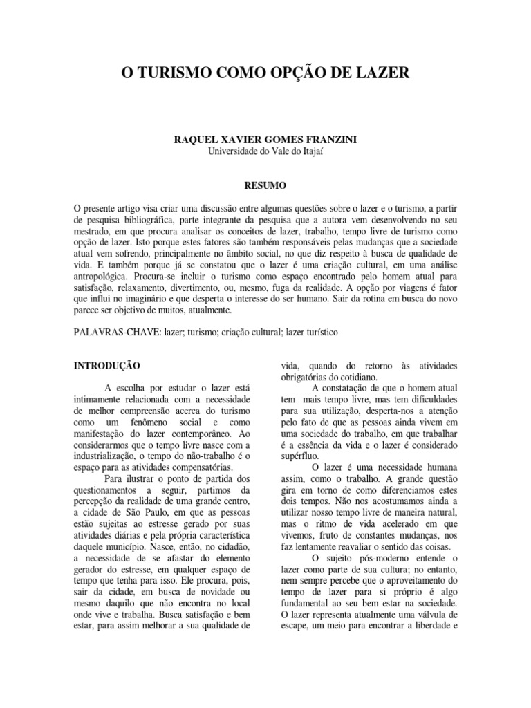 O presente artigo visa criar uma discusso entre algumas questes sobre o lazer e o turismo, a partir de pesquisa bibliogrfica, parte integrante da pesquisa que a autora vem desenvolvendo no seu mestrado, em que procura analisar os conceitos de lazer, trabalho, tempo livre de turismo como opo de lazer. Isto porque estes fatores so tambm responsveis pelas mudanas que a sociedade atual vem sofrendo, principalmente no mbito social, no que diz respeito busca de qualidade de vida. E tambm porque j se constatou que o lazer uma criao cultural, em uma anlise antropolgica. Procura-se incluir o turismo como espao encontrado pelo homem atual para satisfao, relaxamento, divertimento, ou, mesmo, fuga da realidade. A opo por viagens fator que influi no imaginrio e que desperta o interesse do ser humano. Sair da rotina em busca do novo parece ser objetivo de muitos, atualmente.